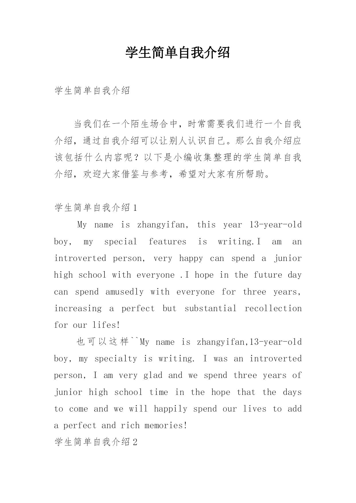 学生简单自我介绍学生简单自我介绍当我们在一个陌生场合中,时常需要我们进行一个自我介绍,通过自我介绍可以让别人认识自己。那么自我介绍应该包括什么内容呢?以下是小编收集整理的学生简单自我介绍,欢迎大家借鉴与参考,希望对大家有所帮助。学生简单自我介绍1Mynameiszhangyifan,thisyear13-year-oldboy,myspecialfeaturesiswriting.Iamanintrovertedperson,veryhappycanspendajuniorhighschoolwithev