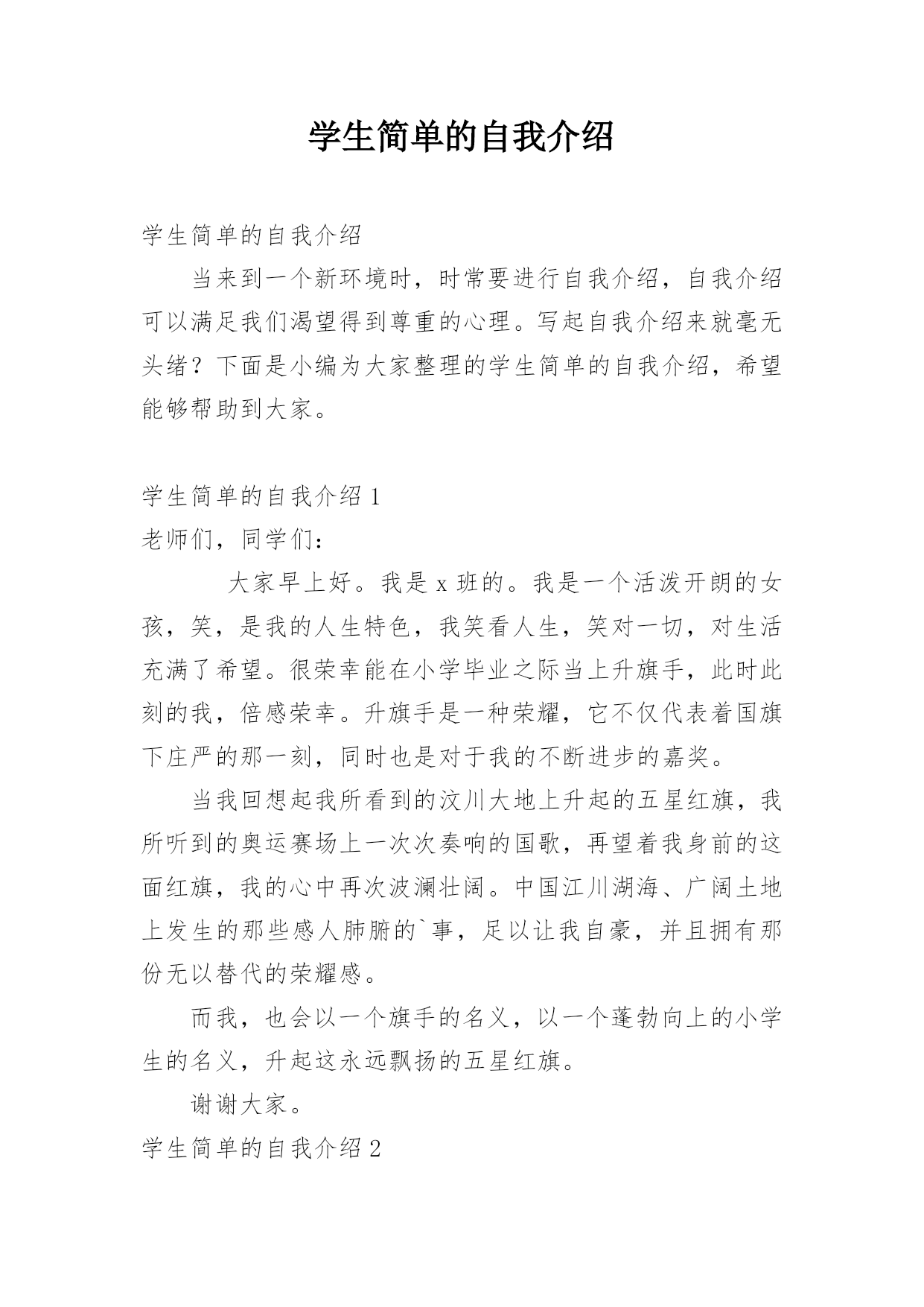 学生简单的自我介绍学生简单的自我介绍当来到一个新环境时,时常要进行自我介绍,自我介绍可以满足我们渴望得到尊重的心理。写起自我介绍来就毫无头绪?下面是小编为大家整理的学生简单的自我介绍,希望能够帮助到大家。学生简单的自我介绍1老师们,同学们:大家早上好。我是x班的。我是一个活泼开朗的女孩,笑,是我的人生特色,我笑看人生,笑对一切,对生活充满了希望。很荣幸能在小学毕业之际当上升旗手,此时此刻的我,倍感荣幸。升旗手是一种荣耀,它不仅代表着国旗下庄严的那一刻,同时也是对于我的不断进步的嘉奖。当我回想起我所看到的汶