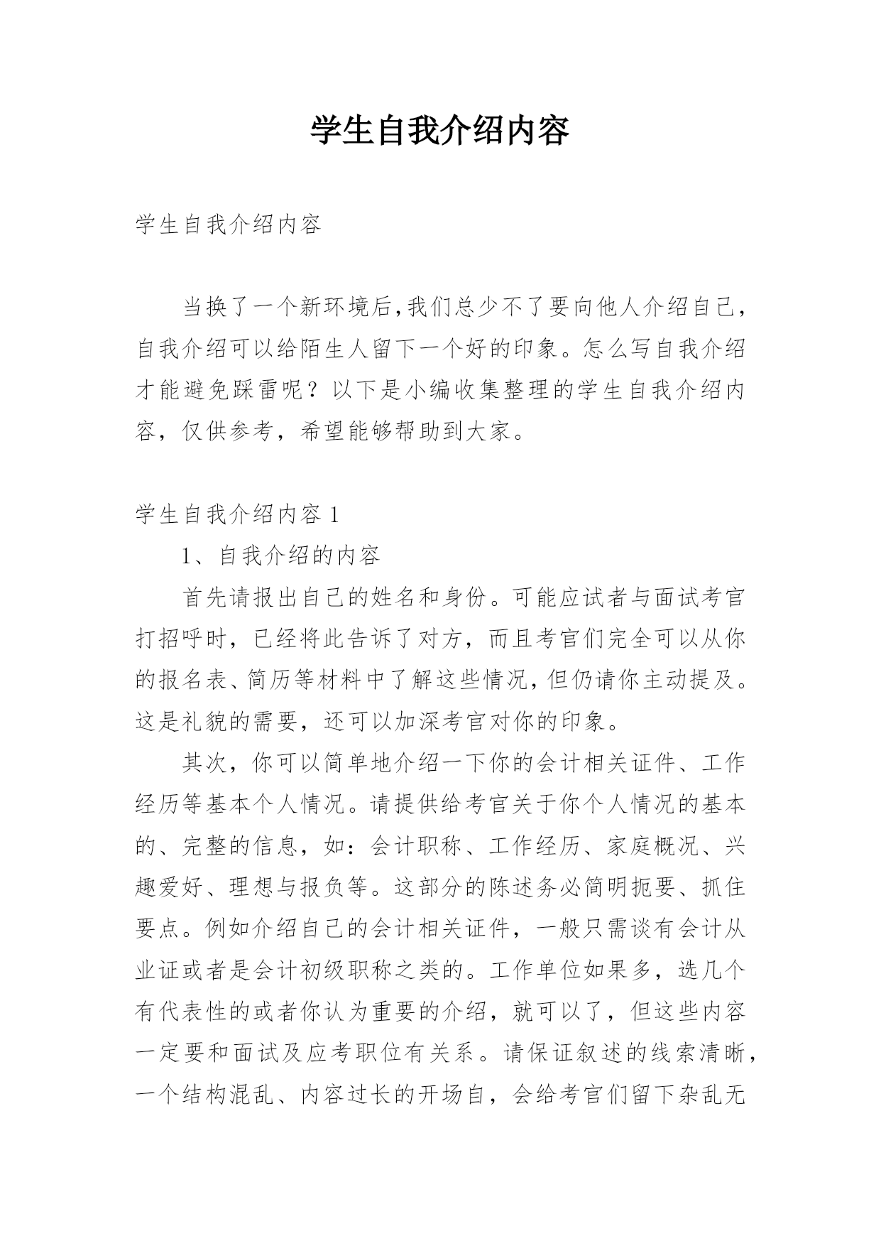 学生自我介绍内容学生自我介绍内容当换了一个新环境后,我们总少不了要向他人介绍自己,自我介绍可以给陌生人留下一个好的印象。怎么写自我介绍才能避免踩雷呢?以下是小编收集整理的学生自我介绍内容,仅供参考,希望能够帮助到大家。学生自我介绍内容11、自我介绍的内容首先请报出自己的姓名和身份。可能应试者与面试考官打招呼时,已经将此告诉了对方,而且考官们完全可以从你的报名表、简历等材料中了解这些情况,但仍请你主动提及。这是礼貌的需要,还可以加深考官对你的印象。其次,你可以简单地介绍一下你的会计相关证件、工作经历等基本个