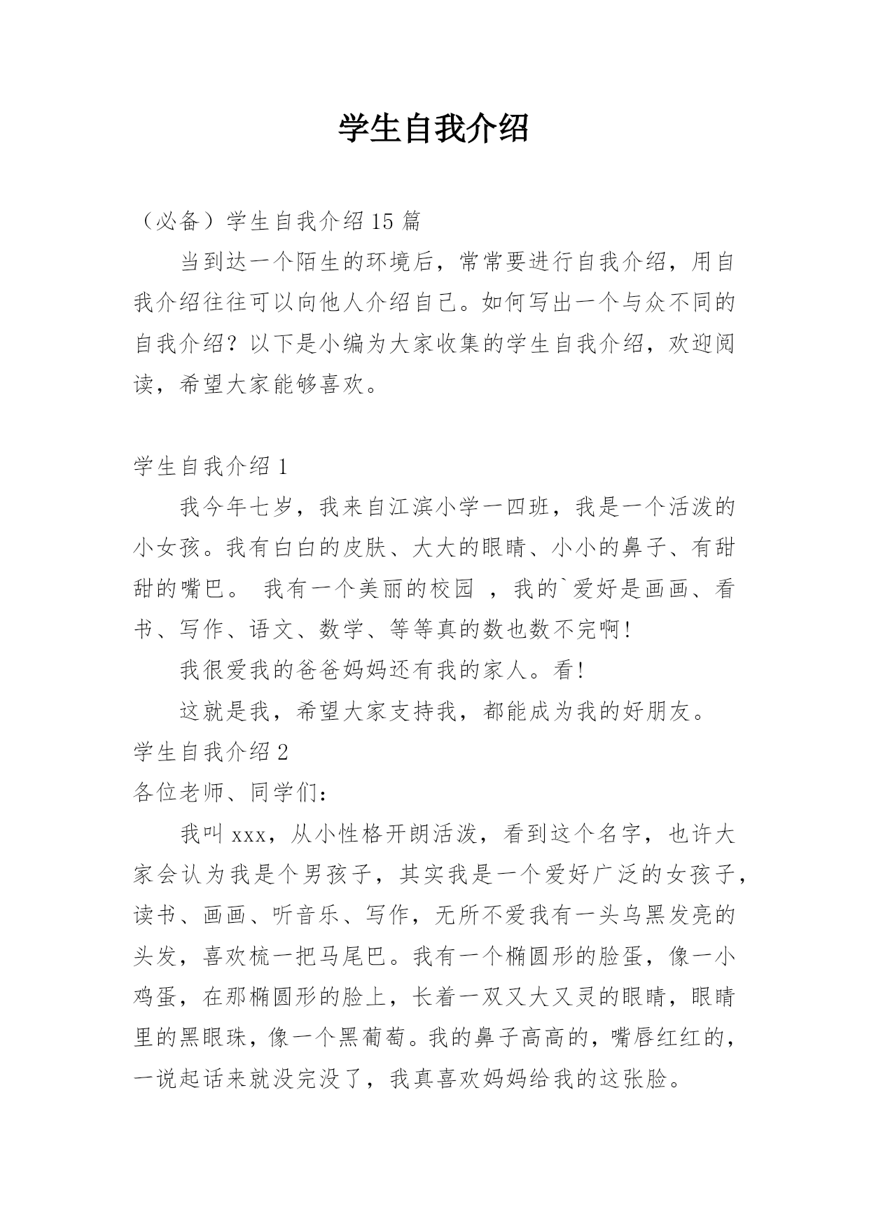 学生自我介绍(必备)学生自我介绍15篇当到达一个陌生的环境后,常常要进行自我介绍,用自我介绍往往可以向他人介绍自己。如何写出一个与众不同的自我介绍?以下是小编为大家收集的学生自我介绍,欢迎阅读,希望大家能够喜欢。学生自我介绍1我今年七岁,我来自江滨小学一四班,我是一个活泼的小女孩。我有白白的皮肤、大大的眼睛、小小的鼻子、有甜甜的嘴巴。我有一个美丽的校园,我的`爱好是画画、看书、写作、语文、数学、等等真的数也数不完啊!我很爱我的爸爸妈妈还有我的家人。看!这就是我,希望大家支持我,都能成为我的好朋友。学生自我