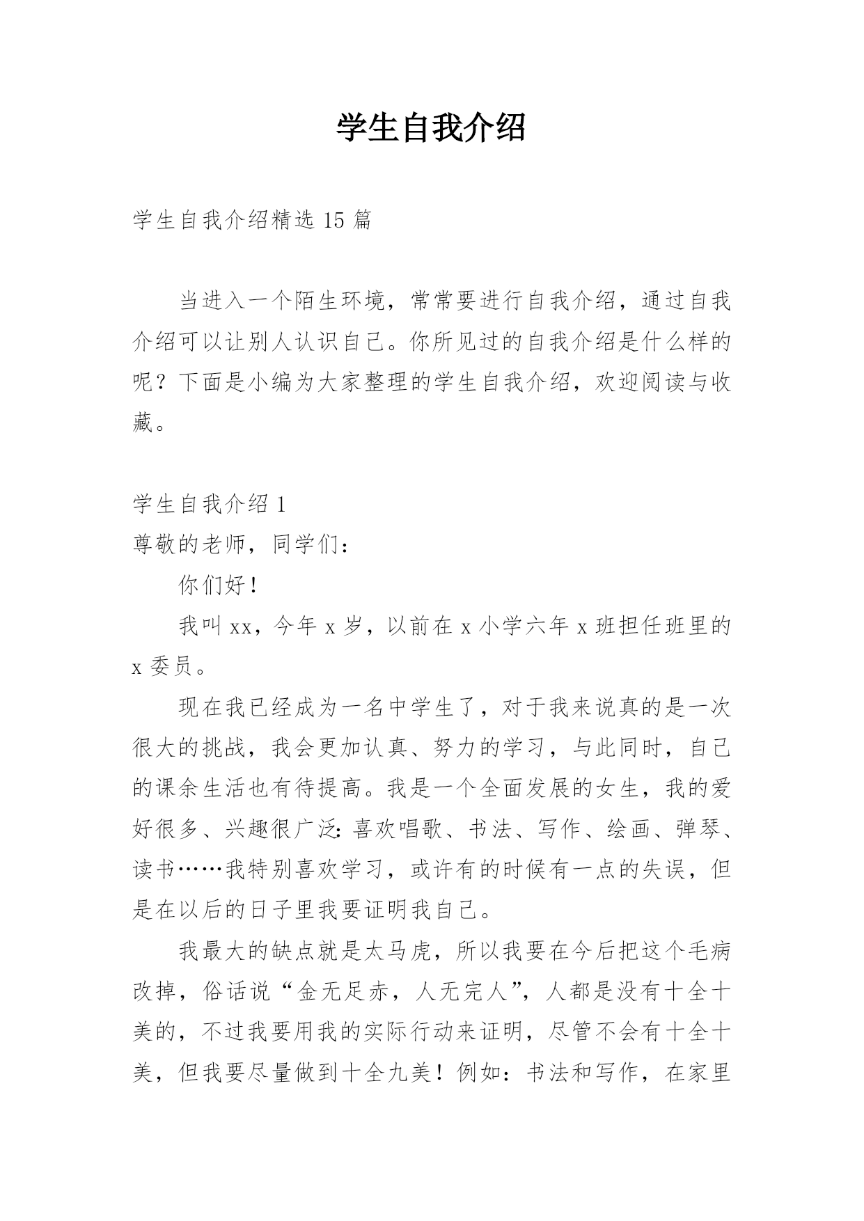学生自我介绍学生自我介绍精选15篇当进入一个陌生环境,常常要进行自我介绍,通过自我介绍可以让别人认识自己。你所见过的自我介绍是什么样的呢?下面是小编为大家整理的学生自我介绍,欢迎阅读与收藏。学生自我介绍1尊敬的老师,同学们:你们好!我叫xx,今年x岁,以前在x小学六年x班担任班里的x委员。现在我已经成为一名中学生了,对于我来说真的是一次很大的挑战,我会更加认真、努力的学习,与此同时,自己的课余生活也有待提高。我是一个全面发展的女生,我的爱好很多、兴趣很广泛:喜欢唱歌、书法、写作、绘画、弹琴、读书……我特别