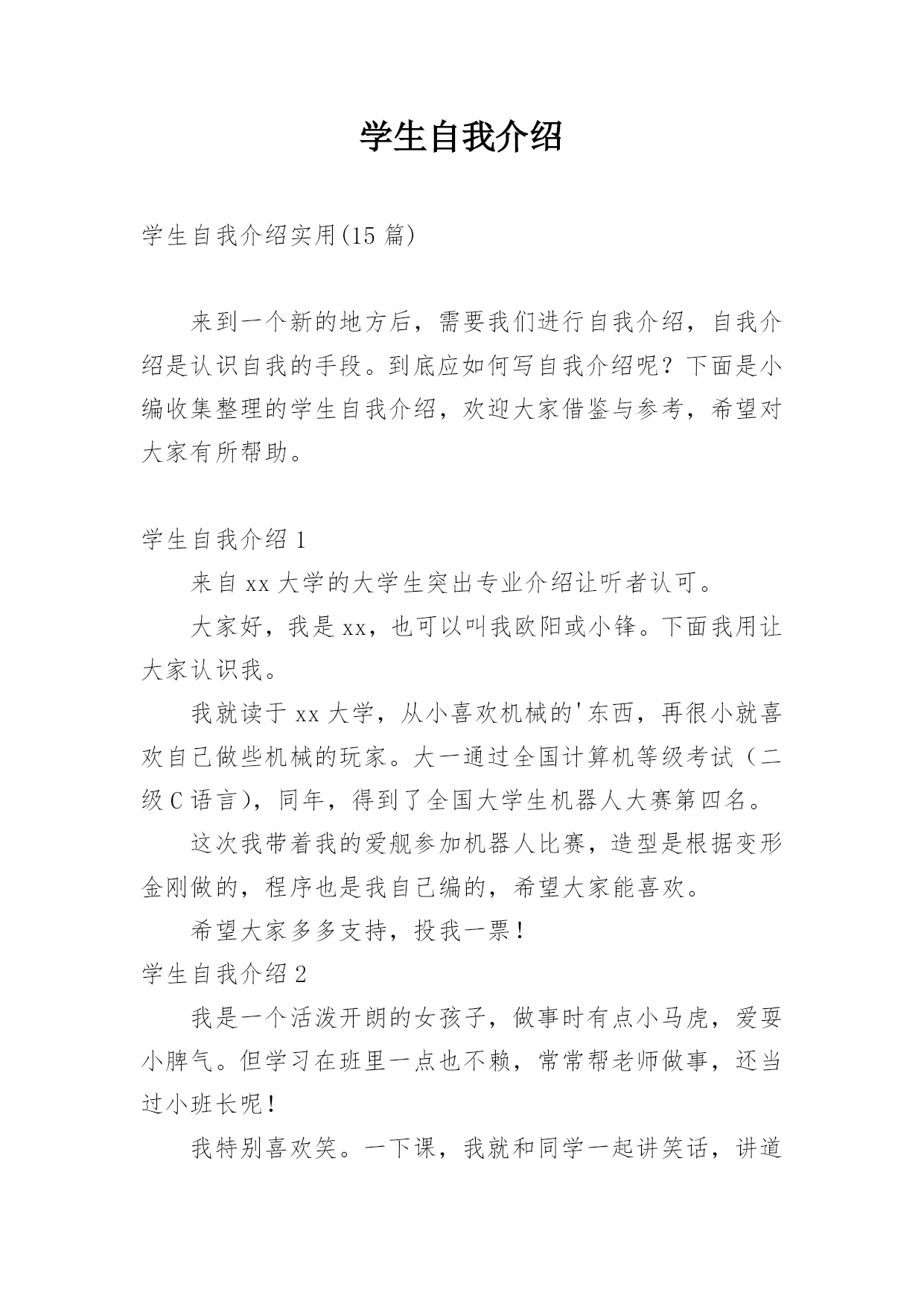 学生自我介绍学生自我介绍实用(15篇)来到一个新的地方后,需要我们进行自我介绍,自我介绍是认识自我的手段。到底应如何写自我介绍呢?下面是小编收集整理的学生自我介绍,欢迎大家借鉴与参考,希望对大家有所帮助。学生自我介绍1来自xx大学的大学生突出专业介绍让听者认可。大家好,我是xx,也可以叫我欧阳或小锋。下面我用让大家认识我。我就读于xx大学,从小喜欢机械的'东西,再很小就喜欢自己做些机械的玩家。大一通过全国计算机等级考试(二级C语言),同年,得到了全国大学生机器人大赛第四名。这次我带着我的爱舰参加机器人比赛