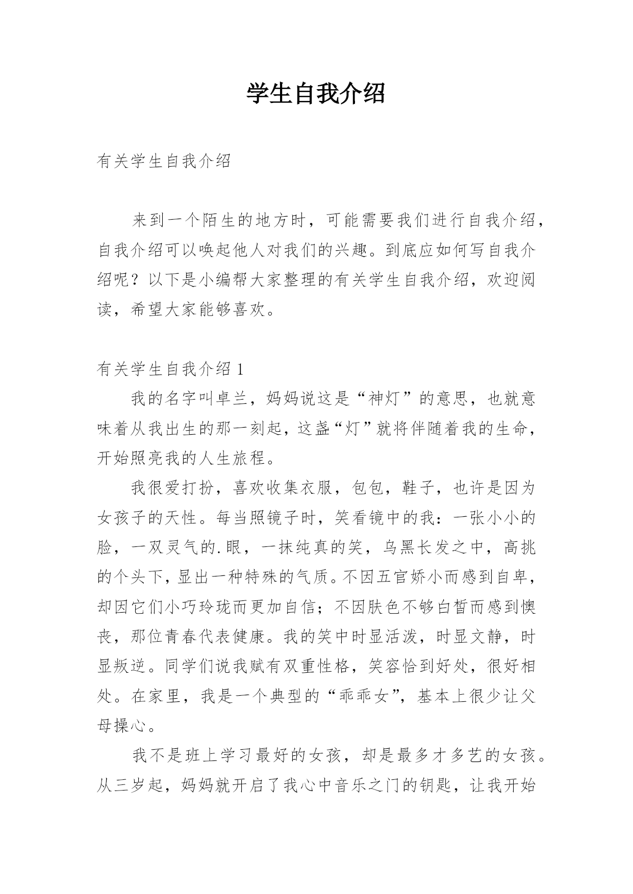 学生自我介绍有关学生自我介绍来到一个陌生的地方时,可能需要我们进行自我介绍,自我介绍可以唤起他人对我们的兴趣。到底应如何写自我介绍呢?以下是小编帮大家整理的有关学生自我介绍,欢迎阅读,希望大家能够喜欢。有关学生自我介绍1我的名字叫卓兰,妈妈说这是“神灯”的意思,也就意味着从我出生的那一刻起,这盏“灯”就将伴随着我的生命,开始照亮我的人生旅程。我很爱打扮,喜欢收集衣服,包包,鞋子,也许是因为女孩子的天性。每当照镜子时,笑看镜中的我:一张小小的脸,一双灵气的.眼,一抹纯真的笑,乌黑长发之中,高挑的个头下,显出
