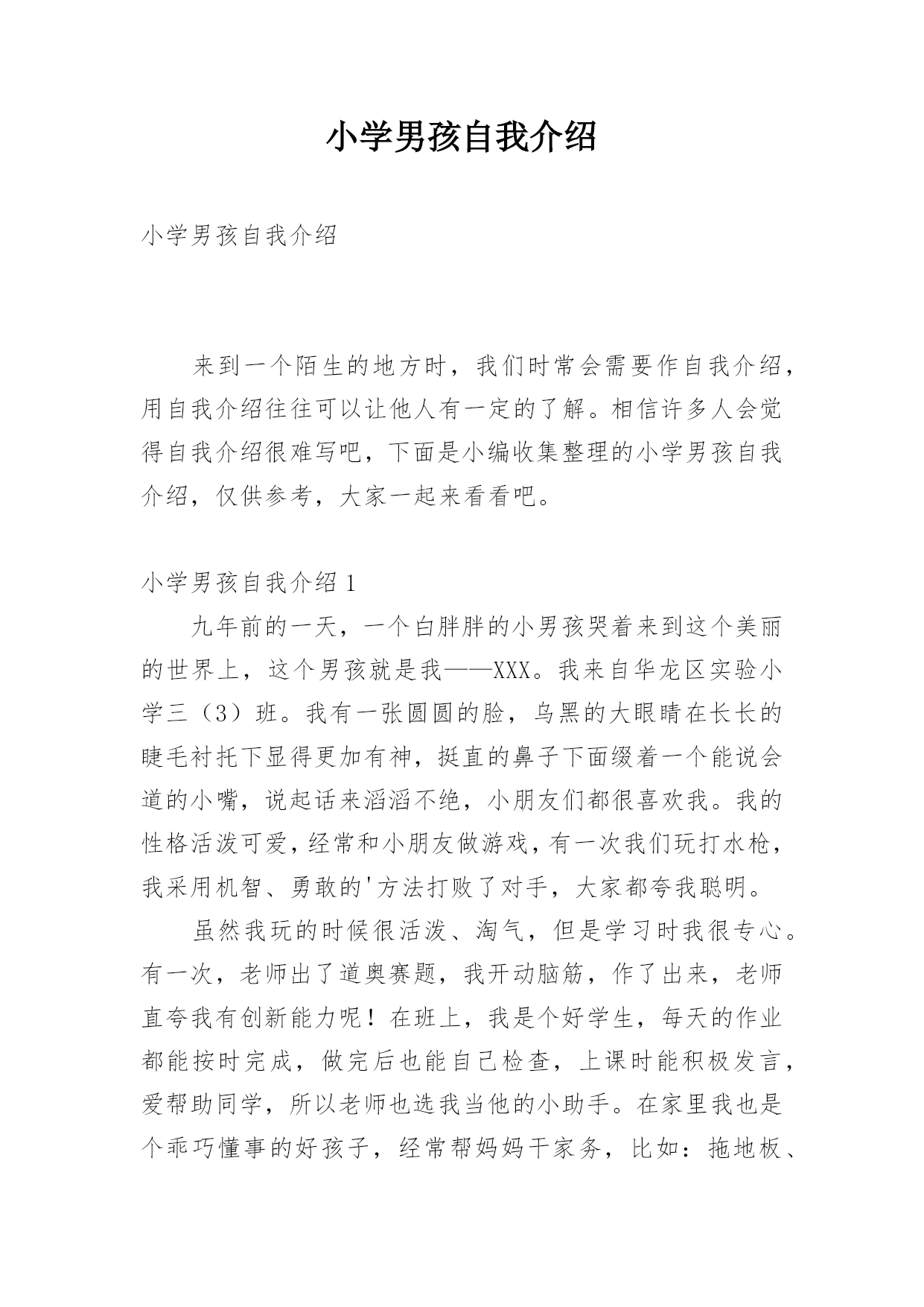 小学男孩自我介绍小学男孩自我介绍来到一个陌生的地方时,我们时常会需要作自我介绍,用自我介绍往往可以让他人有一定的了解。相信许多人会觉得自我介绍很难写吧,下面是小编收集整理的小学男孩自我介绍,仅供参考,大家一起来看看吧。小学男孩自我介绍1九年前的一天,一个白胖胖的小男孩哭着来到这个美丽的世界上,这个男孩就是我——XXX。我来自华龙区实验小学三(3)班。我有一张圆圆的脸,乌黑的大眼睛在长长的睫毛衬托下显得更加有神,挺直的鼻子下面缀着一个能说会道的小嘴,说起话来滔滔不绝,小朋友们都很喜欢我。我的性格活泼可爱,经