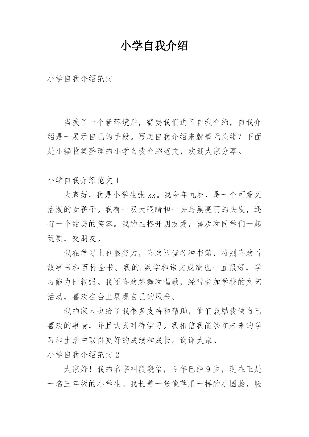小学自我介绍小学自我介绍范文当换了一个新环境后,需要我们进行自我介绍,自我介绍是一展示自己的手段。写起自我介绍来就毫无头绪?下面是小编收集整理的小学自我介绍范文,欢迎大家分享。小学自我介绍范文1大家好,我是小学生张xx。我今年九岁,是一个可爱又活泼的女孩子。我有一双大眼睛和一头乌黑亮丽的头发,还有一个甜美的笑容。我的性格开朗友爱,喜欢和同学们一起玩耍,交朋友。我在学习上也很努力,喜欢阅读各种书籍,特别喜欢看故事书和百科全书。我的.数学和语文成绩也一直很好,学习能力比较强。我还喜欢跳舞和唱歌,经常参加学校的