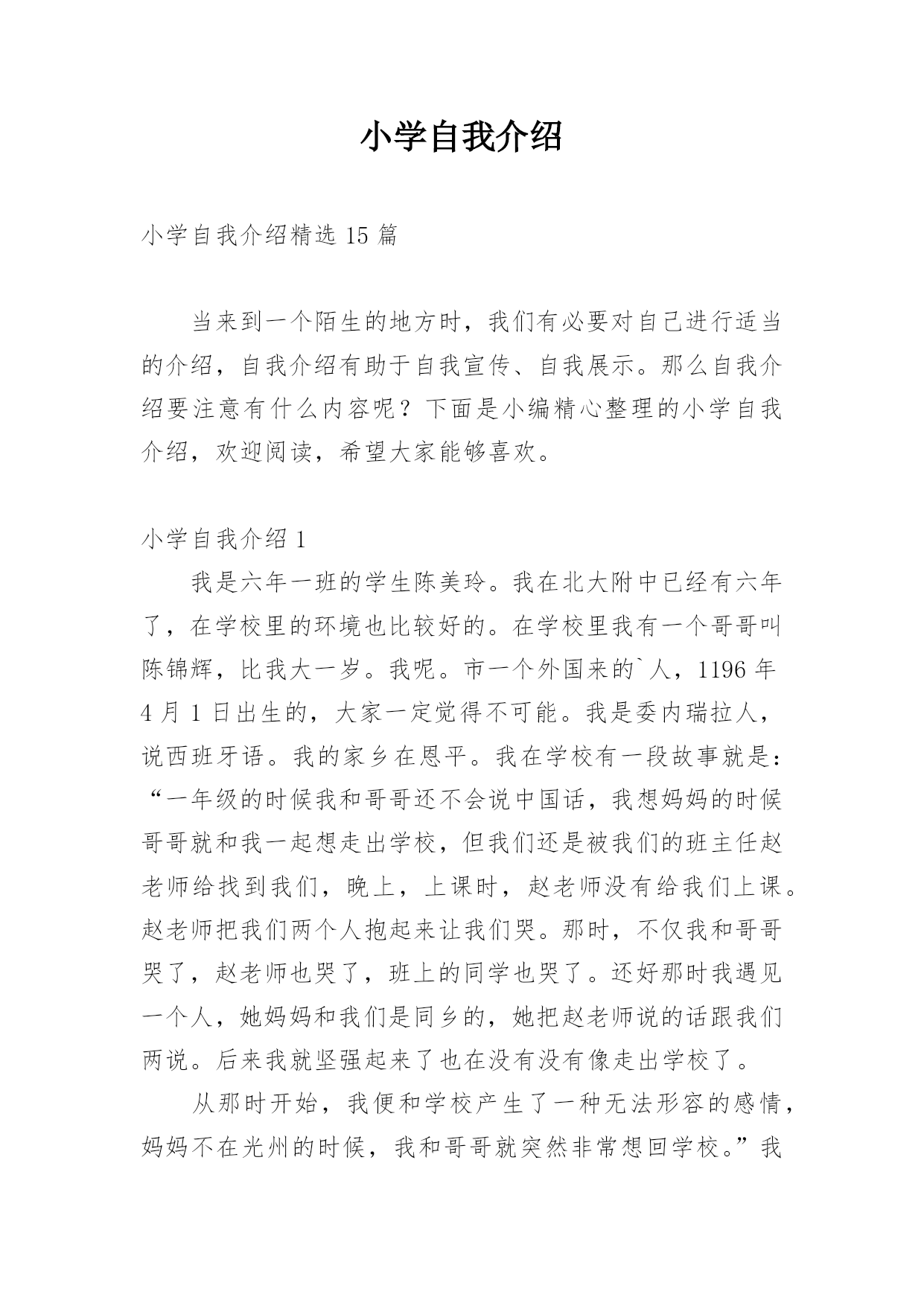 小学自我介绍小学自我介绍精选15篇当来到一个陌生的地方时,我们有必要对自己进行适当的介绍,自我介绍有助于自我宣传、自我展示。那么自我介绍要注意有什么内容呢?下面是小编精心整理的小学自我介绍,欢迎阅读,希望大家能够喜欢。小学自我介绍1我是六年一班的学生陈美玲。我在北大附中已经有六年了,在学校里的环境也比较好的。在学校里我有一个哥哥叫陈锦辉,比我大一岁。我呢。市一个外国来的`人,1196年4月1日出生的,大家一定觉得不可能。我是委内瑞拉人,说西班牙语。我的家乡在恩平。我在学校有一段故事就是:“一年级的时候我和