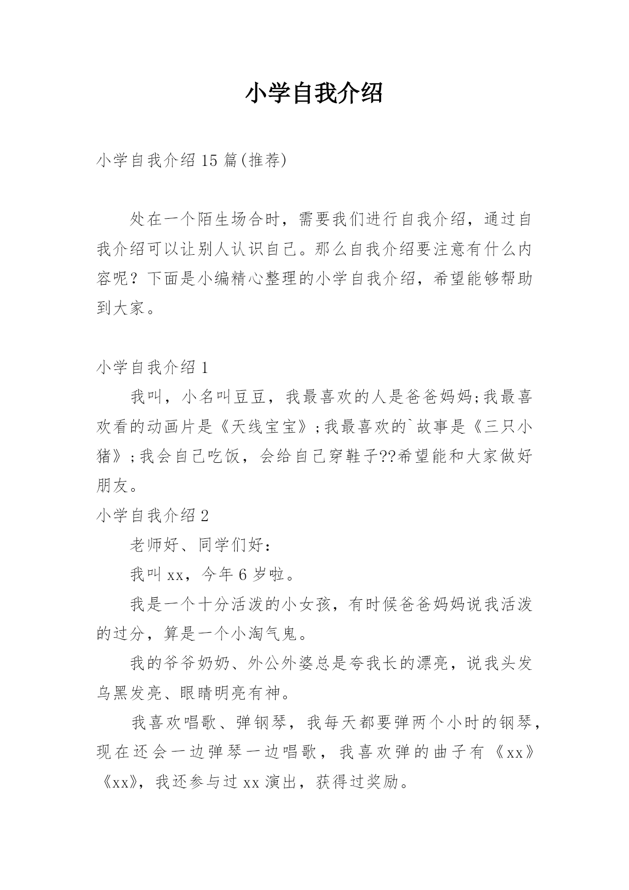 小学自我介绍小学自我介绍15篇(推荐)处在一个陌生场合时,需要我们进行自我介绍,通过自我介绍可以让别人认识自己。那么自我介绍要注意有什么内容呢?下面是小编精心整理的小学自我介绍,希望能够帮助到大家。小学自我介绍1我叫,小名叫豆豆,我最喜欢的人是爸爸妈妈;我最喜欢看的动画片是《天线宝宝》;我最喜欢的`故事是《三只小猪》;我会自己吃饭,会给自己穿鞋子??希望能和大家做好朋友。小学自我介绍2老师好、同学们好:我叫xx,今年6岁啦。我是一个十分活泼的小女孩,有时候爸爸妈妈说我活泼的过分,算是一个小淘气鬼。我的爷爷