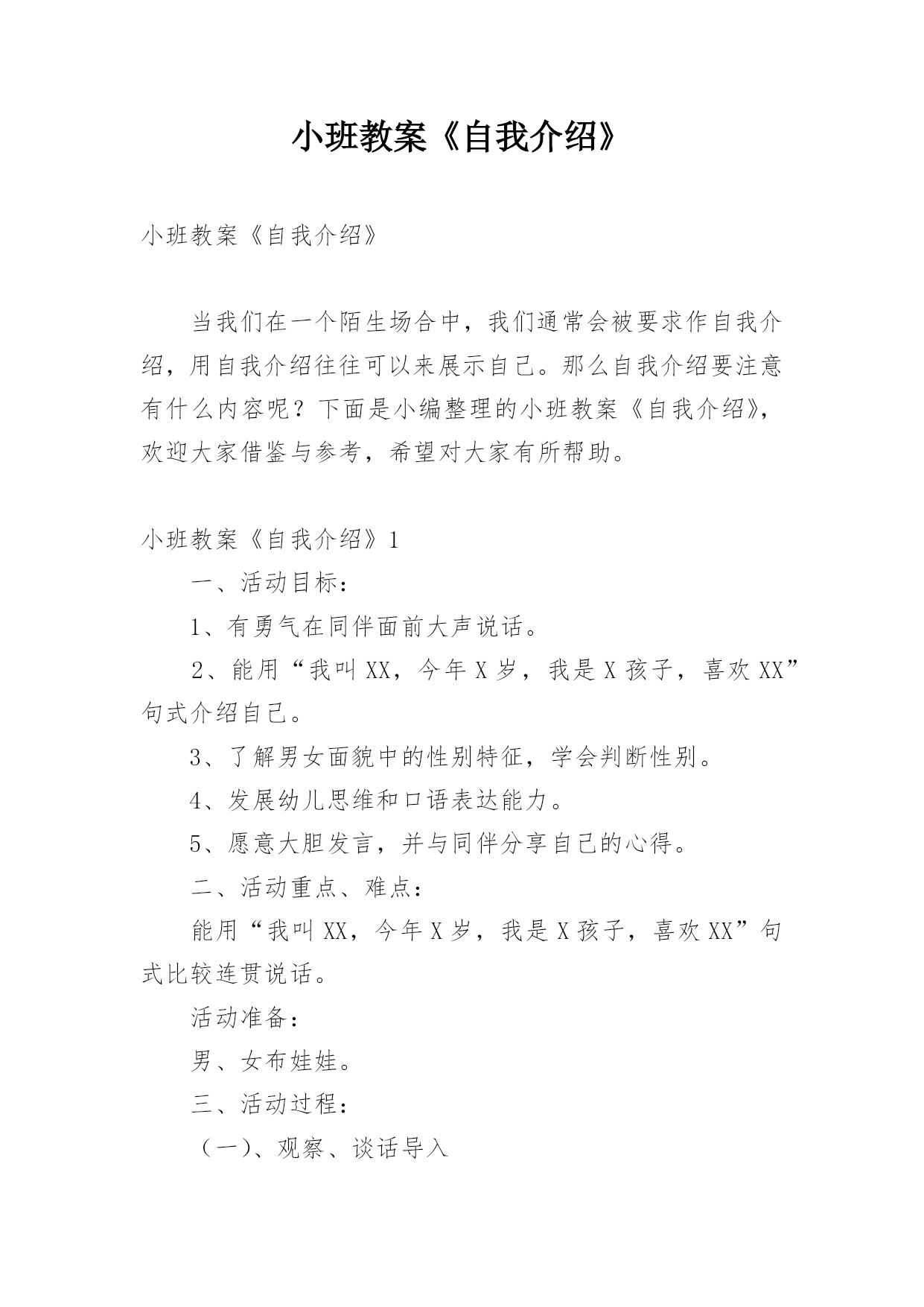 小班教案《自我介绍》小班教案《自我介绍》当我们在一个陌生场合中,我们通常会被要求作自我介绍,用自我介绍往往可以来展示自己。那么自我介绍要注意有什么内容呢?下面是小编整理的小班教案《自我介绍》,欢迎大家借鉴与参考,希望对大家有所帮助。小班教案《自我介绍》1一、活动目标:1、有勇气在同伴面前大声说话。2、能用“我叫XX,今年X岁,我是X孩子,喜欢XX”句式介绍自己。3、了解男女面貌中的性别特征,学会判断性别。4、发展幼儿思维和口语表达能力。5、愿意大胆发言,并与同伴分享自己的心得。二、活动重点、难点:能用“我