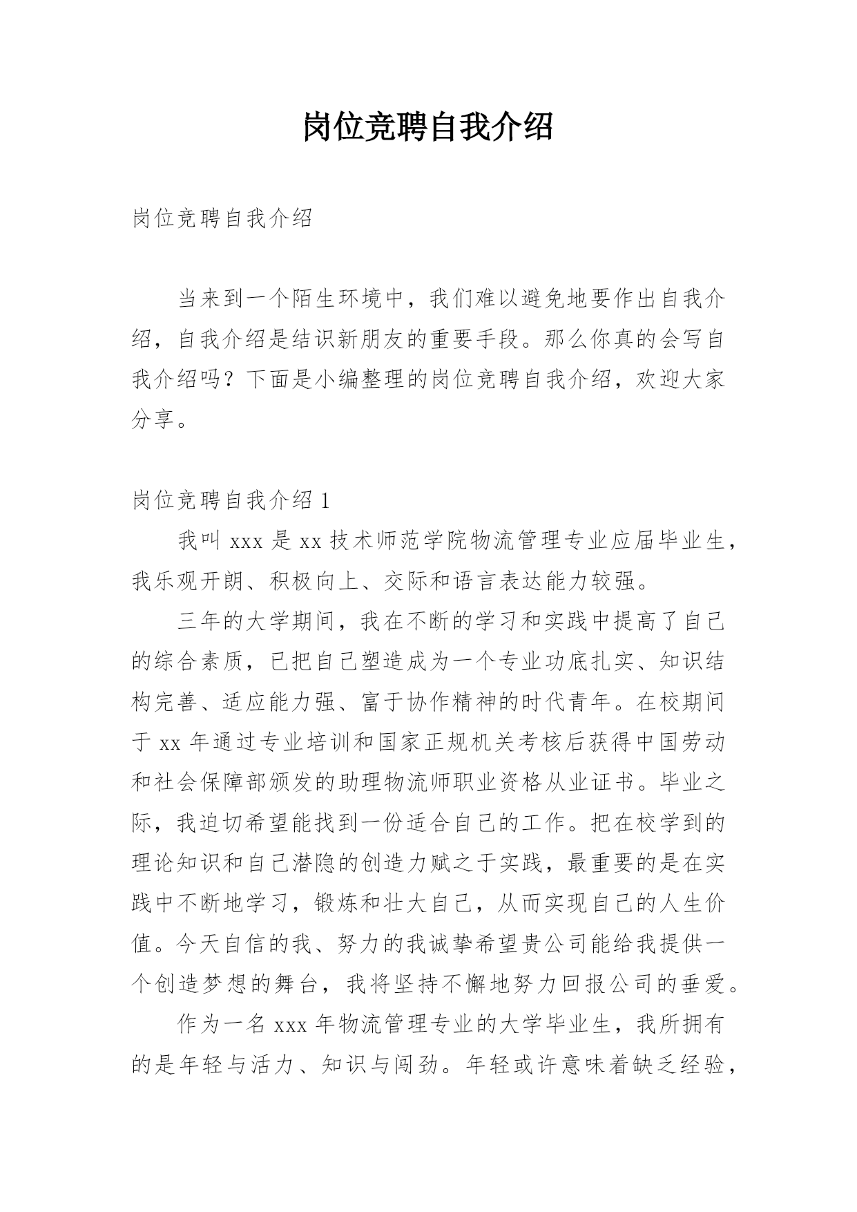 岗位竞聘自我介绍岗位竞聘自我介绍当来到一个陌生环境中,我们难以避免地要作出自我介绍,自我介绍是结识新朋友的重要手段。那么你真的会写自我介绍吗?下面是小编整理的岗位竞聘自我介绍,欢迎大家分享。岗位竞聘自我介绍1我叫xxx是xx技术师范学院物流管理专业应届毕业生,我乐观开朗、积极向上、交际和语言表达能力较强。三年的大学期间,我在不断的学习和实践中提高了自己的综合素质,已把自己塑造成为一个专业功底扎实、知识结构完善、适应能力强、富于协作精神的时代青年。在校期间于xx年通过专业培训和国家正规机关考核后获得中国劳动
