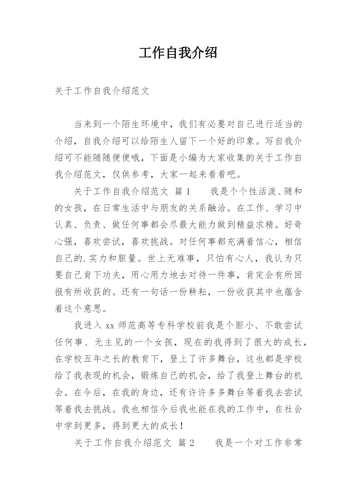 工作自我介绍关于工作自我介绍范文当来到一个陌生环境中,我们有必要对自己进行适当的介绍,自我介绍可以给陌生人留下一个好的印象。写自我介绍可不能随随便便哦,下面是小编为大家收集的关于工作自我介绍范文,仅供参考,大家一起来看看吧。关于工作自我介绍范文篇1我是个个性活泼、随和的女孩,在日常生活中与朋友的关系融洽。在工作、学习中认真、负责、做任何事都会尽最大能力做到精益求精。好奇心强,喜欢尝试,喜欢挑战。对任何事都充满着信心,相信自己的.实力和胆量。世上无难事,只怕有心人,我认为只要自己肯下功夫,用心用力地去对待一