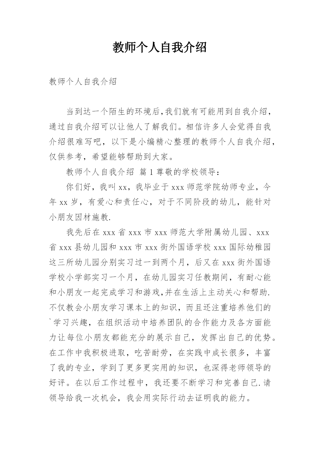教师个人自我介绍教师个人自我介绍当到达一个陌生的环境后,我们就有可能用到自我介绍,通过自我介绍可以让他人了解我们。相信许多人会觉得自我介绍很难写吧,以下是小编精心整理的教师个人自我介绍,仅供参考,希望能够帮助到大家。教师个人自我介绍篇1尊敬的学校领导:你们好,我叫xx,我毕业于xxx师范学院幼师专业,今年xx岁,有爱心和责任心,对于不同阶段的幼儿,能针对小朋友因材施教.我先后在xxx省xxx市xxx师范大学附属幼儿园、xxx省xxx县幼儿园和xxx市xxx街外国语学校xxx国际幼稚园这三所幼儿园分别实习过