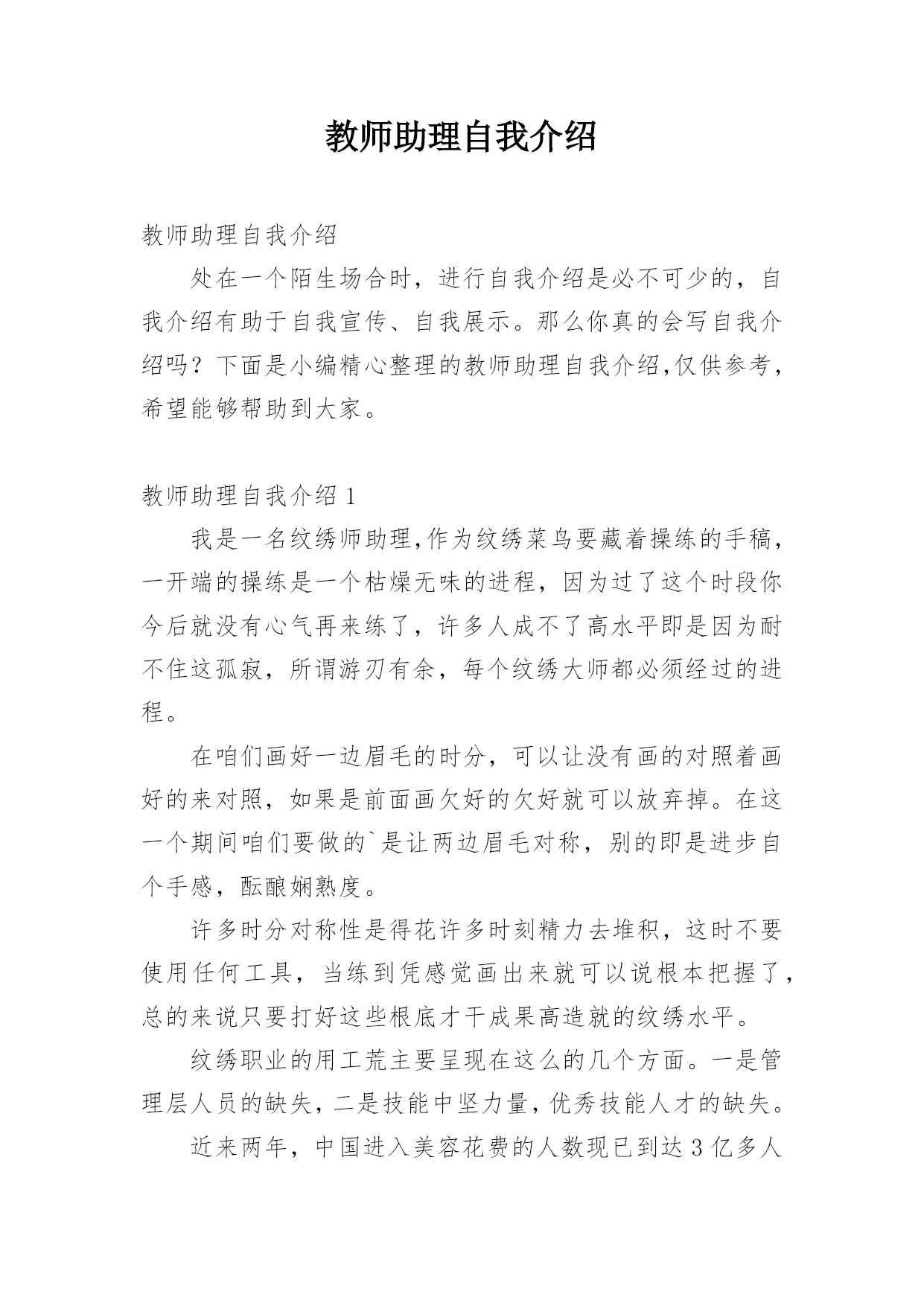 教师助理自我介绍教师助理自我介绍处在一个陌生场合时,进行自我介绍是必不可少的,自我介绍有助于自我宣传、自我展示。那么你真的会写自我介绍吗?下面是小编精心整理的教师助理自我介绍,仅供参考,希望能够帮助到大家。教师助理自我介绍1我是一名纹绣师助理,作为纹绣菜鸟要藏着操练的手稿,一开端的操练是一个枯燥无味的进程,因为过了这个时段你今后就没有心气再来练了,许多人成不了高水平即是因为耐不住这孤寂,所谓游刃有余,每个纹绣大师都必须经过的进程。在咱们画好一边眉毛的时分,可以让没有画的对照着画好的来对照,如果是前面画欠好