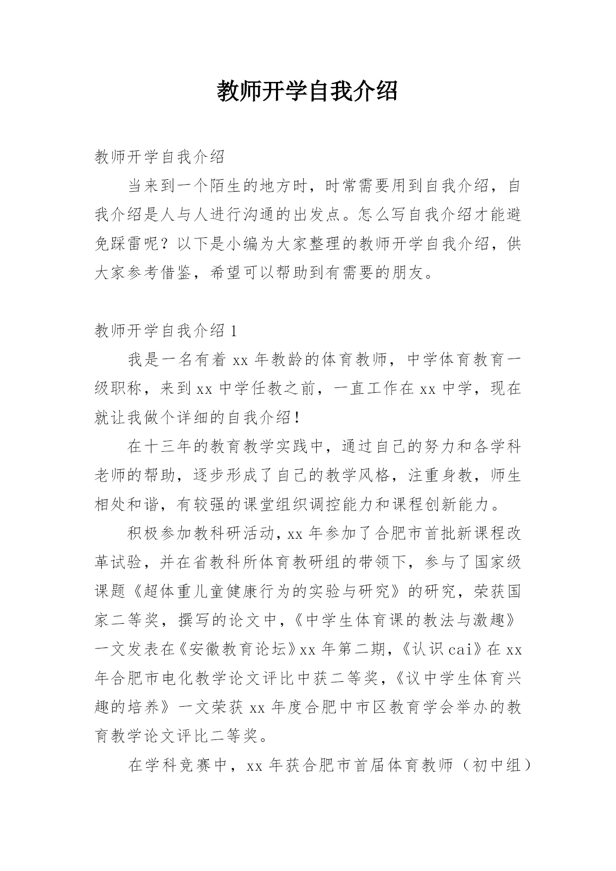 教师开学自我介绍教师开学自我介绍当来到一个陌生的地方时,时常需要用到自我介绍,自我介绍是人与人进行沟通的出发点。怎么写自我介绍才能避免踩雷呢?以下是小编为大家整理的教师开学自我介绍,供大家参考借鉴,希望可以帮助到有需要的朋友。教师开学自我介绍1我是一名有着xx年教龄的体育教师,中学体育教育一级职称,来到xx中学任教之前,一直工作在xx中学,现在就让我做个详细的自我介绍!在十三年的教育教学实践中,通过自己的努力和各学科老师的帮助,逐步形成了自己的教学风格,注重身教,师生相处和谐,有较强的课堂组织调控能力和课