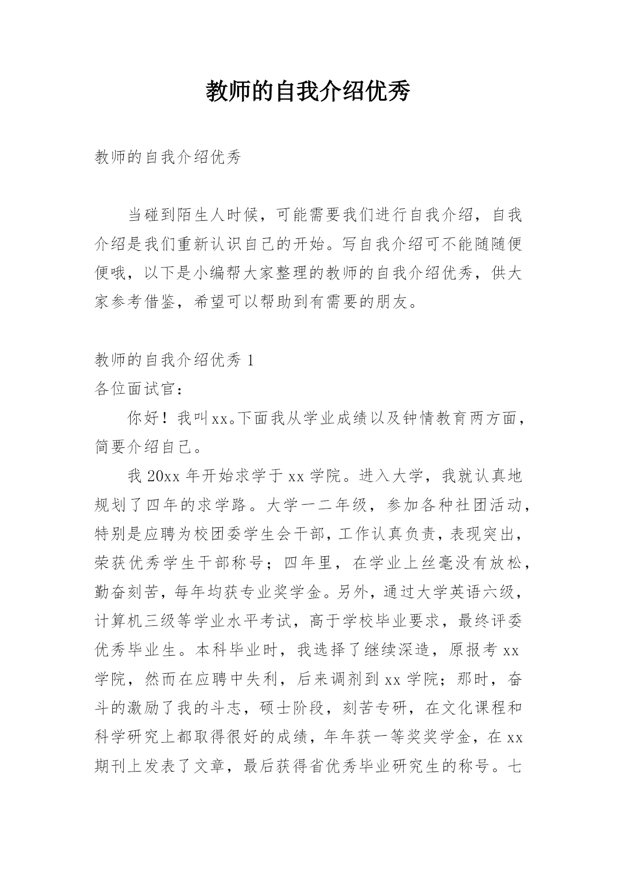 教师的自我介绍优秀教师的自我介绍优秀当碰到陌生人时候,可能需要我们进行自我介绍,自我介绍是我们重新认识自己的开始。写自我介绍可不能随随便便哦,以下是小编帮大家整理的教师的自我介绍优秀,供大家参考借鉴,希望可以帮助到有需要的朋友。教师的自我介绍优秀1各位面试官:你好!我叫xx。下面我从学业成绩以及钟情教育两方面,简要介绍自己。我20xx年开始求学于xx学院。进入大学,我就认真地规划了四年的求学路。大学一二年级,参加各种社团活动,特别是应聘为校团委学生会干部,工作认真负责,表现突出,荣获优秀学生干部称号;四年