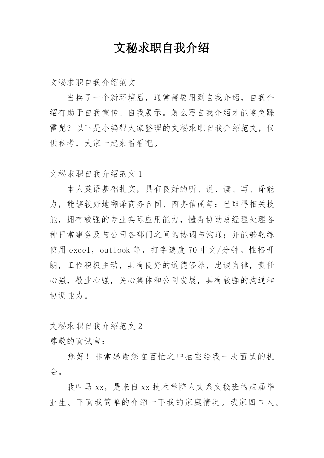 文秘求职自我介绍文秘求职自我介绍范文当换了一个新环境后,通常需要用到自我介绍,自我介绍有助于自我宣传、自我展示。怎么写自我介绍才能避免踩雷呢?以下是小编帮大家整理的文秘求职自我介绍范文,仅供参考,大家一起来看看吧。文秘求职自我介绍范文1本人英语基础扎实,具有良好的听、说、读、写、译能力,能够较好地翻译商务合同、商务信函等;已取得相关技能,拥有较强的专业实际应用能力,懂得协助总经理处理各种日常事务及与公司各部门之间的协调与沟通;并能够熟练使用excel,outlook等,打字速度70中文/分钟。性格开朗,工