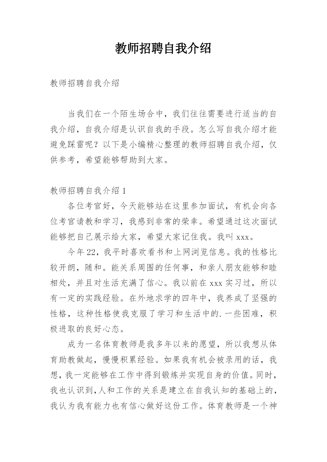 教师招聘自我介绍教师招聘自我介绍当我们在一个陌生场合中,我们往往需要进行适当的自我介绍,自我介绍是认识自我的手段。怎么写自我介绍才能避免踩雷呢?以下是小编精心整理的教师招聘自我介绍,仅供参考,希望能够帮助到大家。教师招聘自我介绍1各位考官好,今天能够站在这里参加面试,有机会向各位考官请教和学习,我感到非常的荣幸。希望通过这次面试能够把自己展示给大家,希望大家记住我。我叫xxx。今年22,我平时喜欢看书和上网浏览信息。我的性格比较开朗,随和。能关系周围的任何事,和亲人朋友能够和睦相处,并且对生活充满了信心。