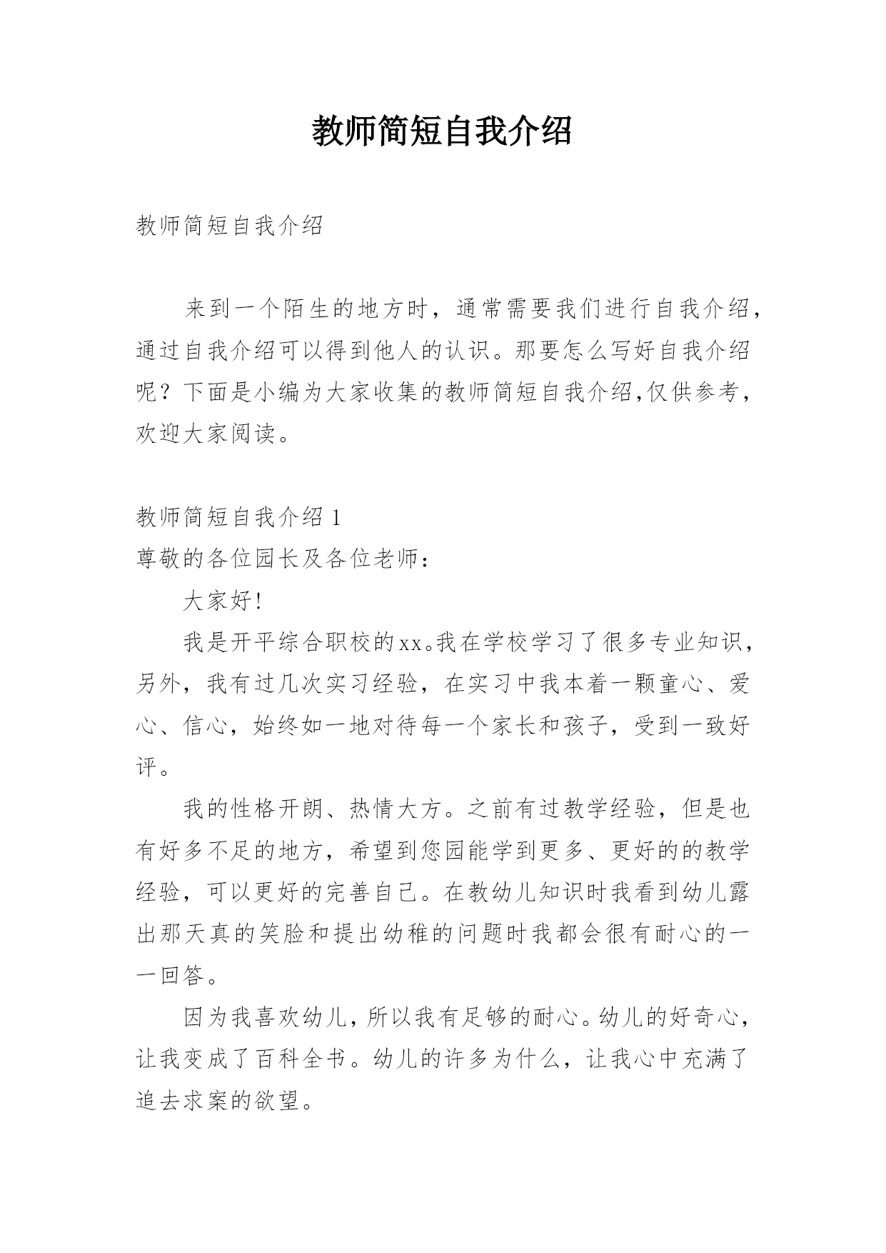 教师简短自我介绍教师简短自我介绍来到一个陌生的地方时,通常需要我们进行自我介绍,通过自我介绍可以得到他人的认识。那要怎么写好自我介绍呢?下面是小编为大家收集的教师简短自我介绍,仅供参考,欢迎大家阅读。教师简短自我介绍1尊敬的各位园长及各位老师:大家好!我是开平综合职校的xx。我在学校学习了很多专业知识,另外,我有过几次实习经验,在实习中我本着一颗童心、爱心、信心,始终如一地对待每一个家长和孩子,受到一致好评。我的性格开朗、热情大方。之前有过教学经验,但是也有好多不足的地方,希望到您园能学到更多、更好的的教