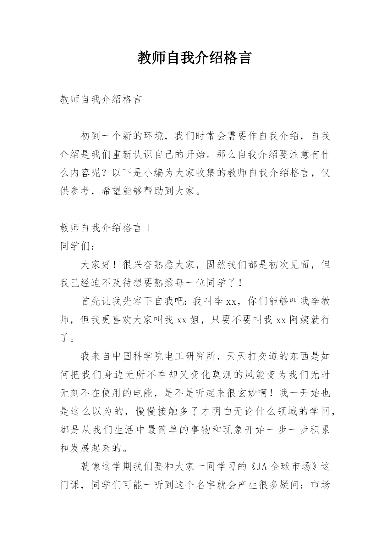 教师自我介绍格言教师自我介绍格言初到一个新的环境,我们时常会需要作自我介绍,自我介绍是我们重新认识自己的开始。那么自我介绍要注意有什么内容呢?以下是小编为大家收集的教师自我介绍格言,仅供参考,希望能够帮助到大家。教师自我介绍格言1同学们:大家好!很兴奋熟悉大家,固然我们都是初次见面,但我已经迫不及待想要熟悉每一位同学了!首先让我先容下自我吧:我叫李xx,你们能够叫我李教师,但我更喜欢大家叫我xx姐,只要不要叫我xx阿姨就行了。我来自中国科学院电工研究所,天天打交道的东西是如何把我们身边无所不在却又变化莫测