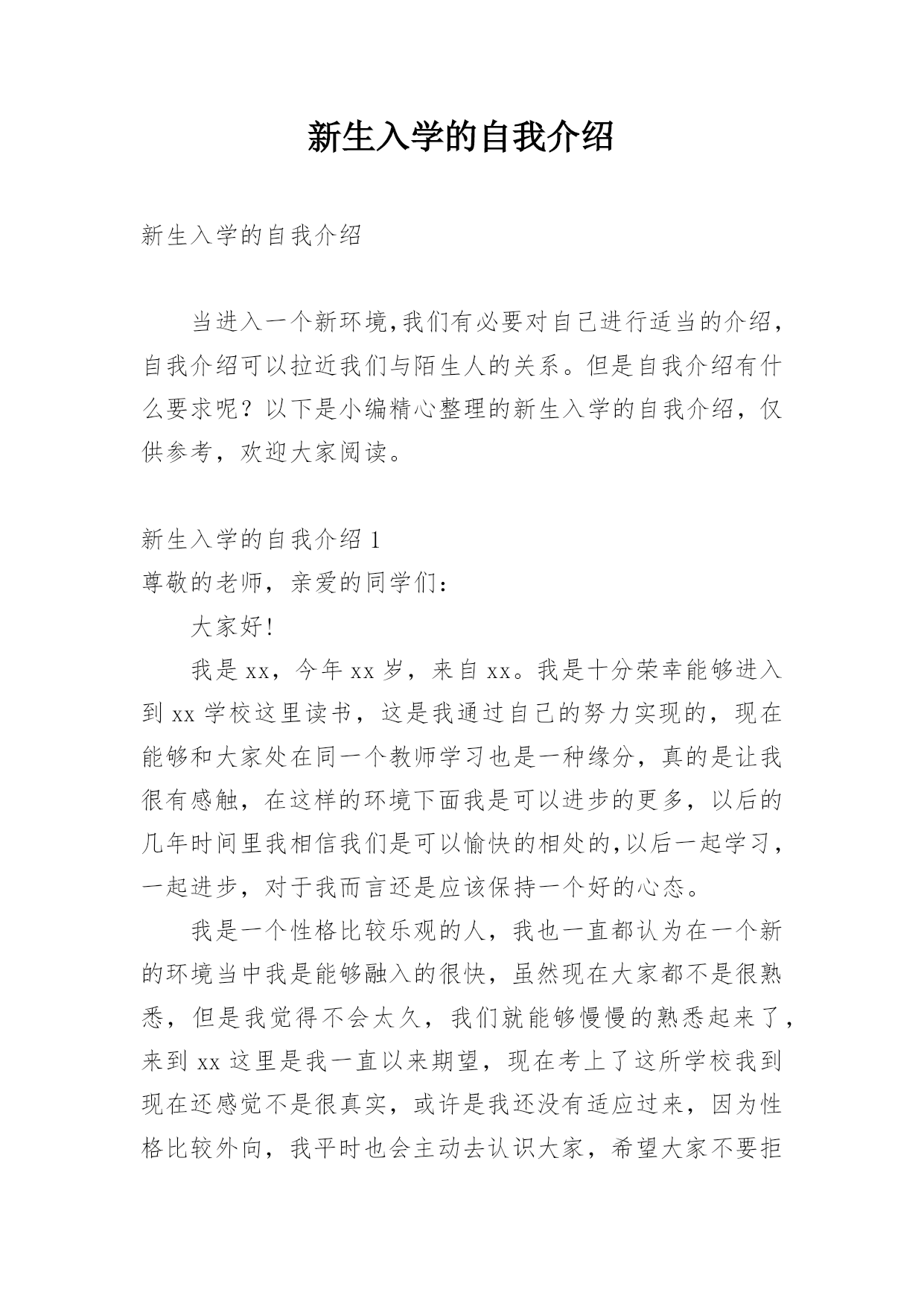 新生入学的自我介绍新生入学的自我介绍当进入一个新环境,我们有必要对自己进行适当的介绍,自我介绍可以拉近我们与陌生人的关系。但是自我介绍有什么要求呢?以下是小编精心整理的新生入学的自我介绍,仅供参考,欢迎大家阅读。新生入学的自我介绍1尊敬的老师,亲爱的同学们:大家好!我是xx,今年xx岁,来自xx。我是十分荣幸能够进入到xx学校这里读书,这是我通过自己的努力实现的,现在能够和大家处在同一个教师学习也是一种缘分,真的是让我很有感触,在这样的环境下面我是可以进步的更多,以后的几年时间里我相信我们是可以愉快的相处