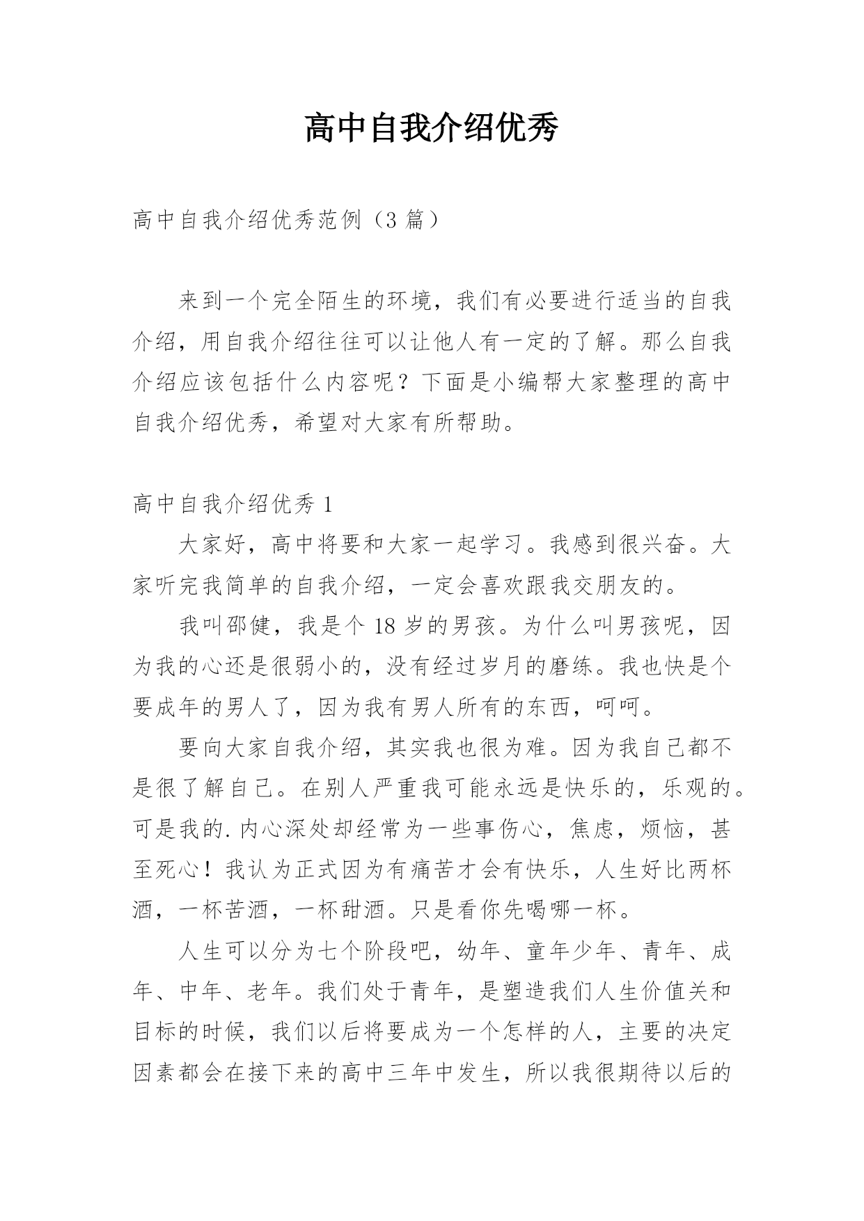 高中自我介绍优秀高中自我介绍优秀范例(3篇)来到一个完全陌生的环境,我们有必要进行适当的自我介绍,用自我介绍往往可以让他人有一定的了解。那么自我介绍应该包括什么内容呢?下面是小编帮大家整理的高中自我介绍优秀,希望对大家有所帮助。高中自我介绍优秀1大家好,高中将要和大家一起学习。我感到很兴奋。大家听完我简单的自我介绍,一定会喜欢跟我交朋友的。我叫邵健,我是个18岁的男孩。为什么叫男孩呢,因为我的心还是很弱小的,没有经过岁月的磨练。我也快是个要成年的男人了,因为我有男人所有的东西,呵呵。要向大家自我介绍,其实