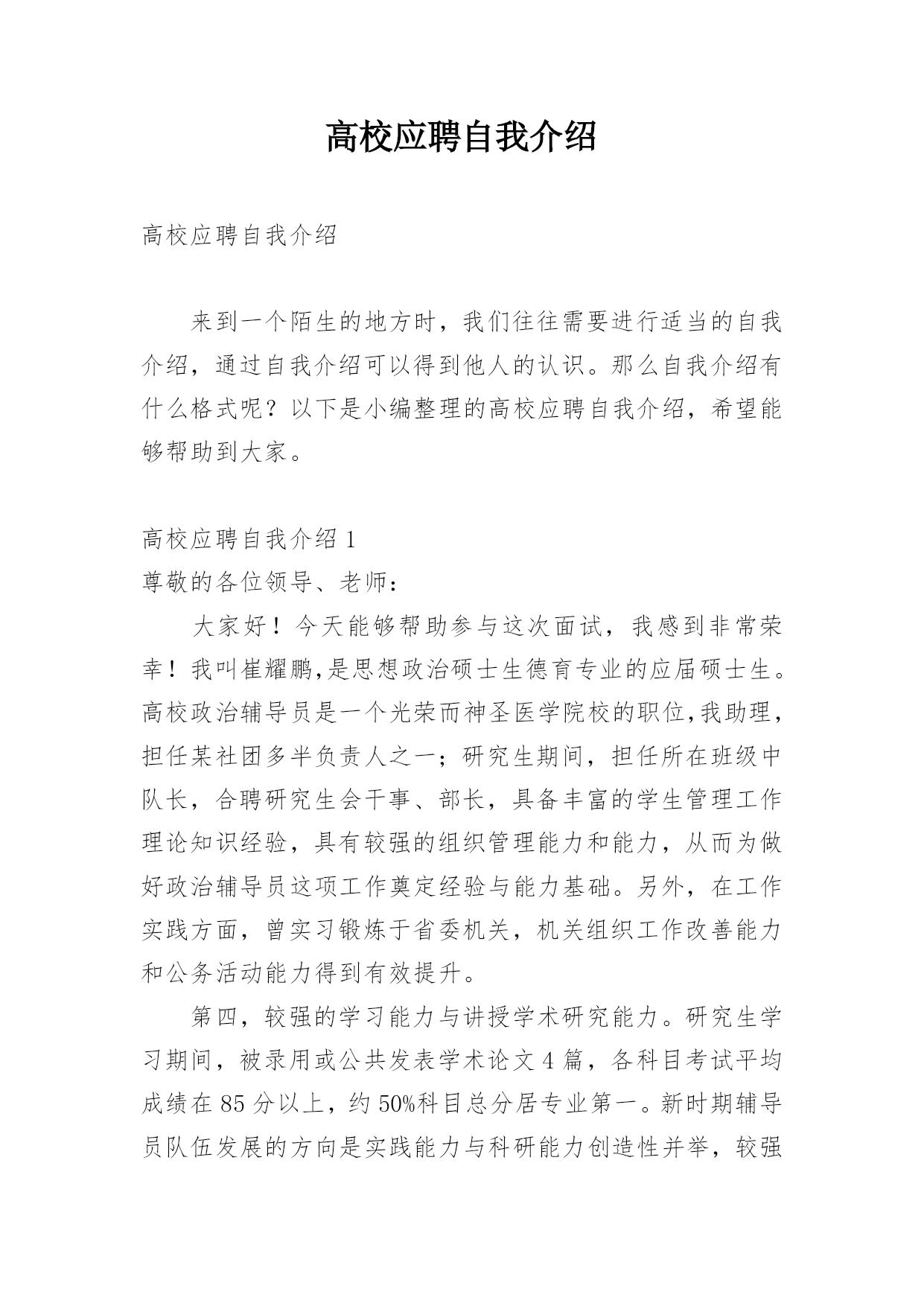 高校应聘自我介绍高校应聘自我介绍来到一个陌生的地方时,我们往往需要进行适当的自我介绍,通过自我介绍可以得到他人的认识。那么自我介绍有什么格式呢?以下是小编整理的高校应聘自我介绍,希望能够帮助到大家。高校应聘自我介绍1尊敬的各位领导、老师:大家好!今天能够帮助参与这次面试,我感到非常荣幸!我叫崔耀鹏,是思想政治硕士生德育专业的应届硕士生。高校政治辅导员是一个光荣而神圣医学院校的职位,我助理,担任某社团多半负责人之一;研究生期间,担任所在班级中队长,合聘研究生会干事、部长,具备丰富的学生管理工作理论知识经验,