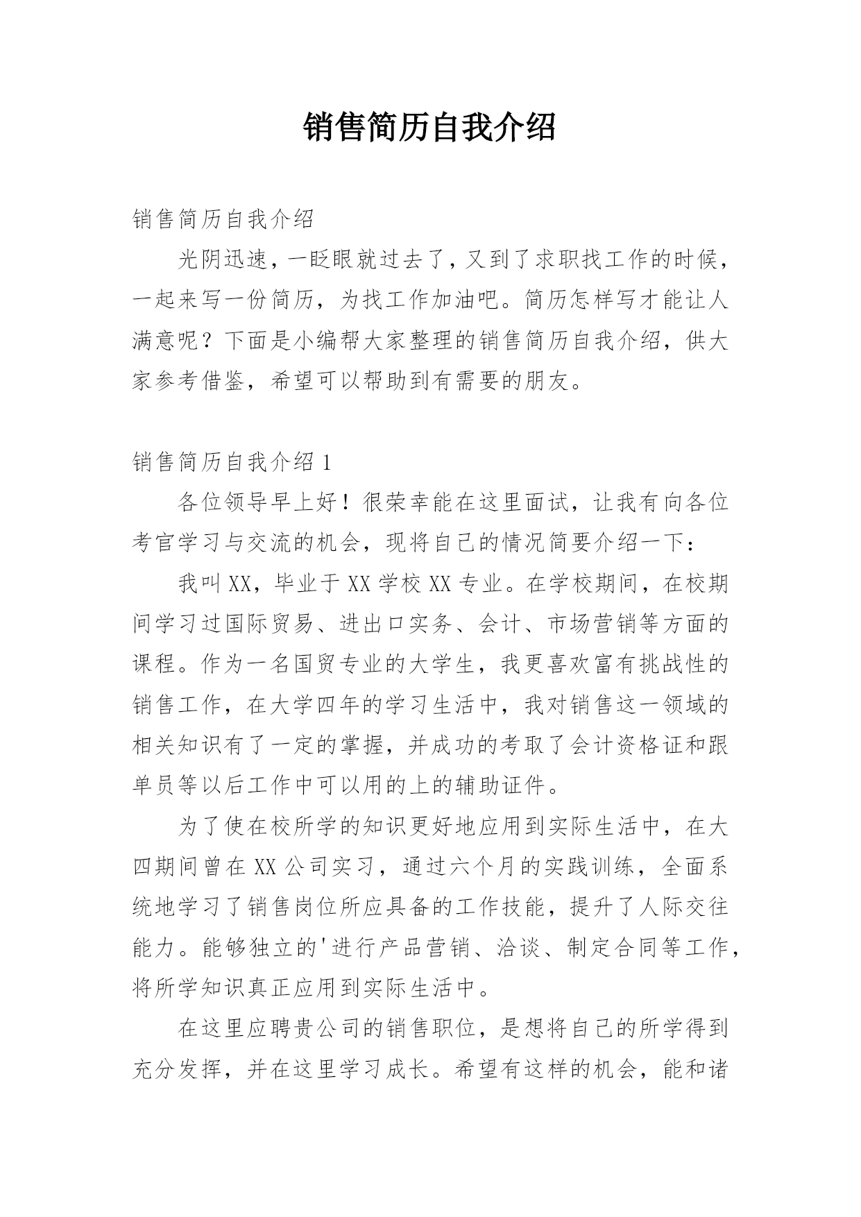 销售简历自我介绍销售简历自我介绍光阴迅速,一眨眼就过去了,又到了求职找工作的时候,一起来写一份简历,为找工作加油吧。简历怎样写才能让人满意呢?下面是小编帮大家整理的销售简历自我介绍,供大家参考借鉴,希望可以帮助到有需要的朋友。销售简历自我介绍1各位领导早上好!很荣幸能在这里面试,让我有向各位考官学习与交流的机会,现将自己的情况简要介绍一下:我叫XX,毕业于XX学校XX专业。在学校期间,在校期间学习过国际贸易、进出口实务、会计、市场营销等方面的课程。作为一名国贸专业的大学生,我更喜欢富有挑战性的销售工作,在