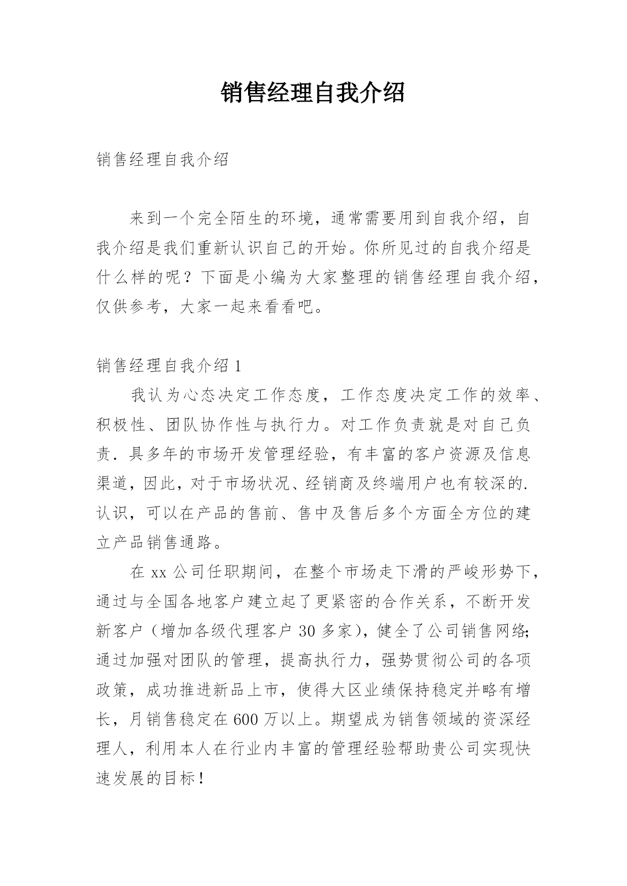 销售经理自我介绍销售经理自我介绍来到一个完全陌生的环境,通常需要用到自我介绍,自我介绍是我们重新认识自己的开始。你所见过的自我介绍是什么样的呢?下面是小编为大家整理的销售经理自我介绍,仅供参考,大家一起来看看吧。销售经理自我介绍1我认为心态决定工作态度,工作态度决定工作的效率、积极性、团队协作性与执行力。对工作负责就是对自己负责.具多年的市场开发管理经验,有丰富的客户资源及信息渠道,因此,对于市场状况、经销商及终端用户也有较深的.认识,可以在产品的售前、售中及售后多个方面全方位的建立产品销售通路。在xx公