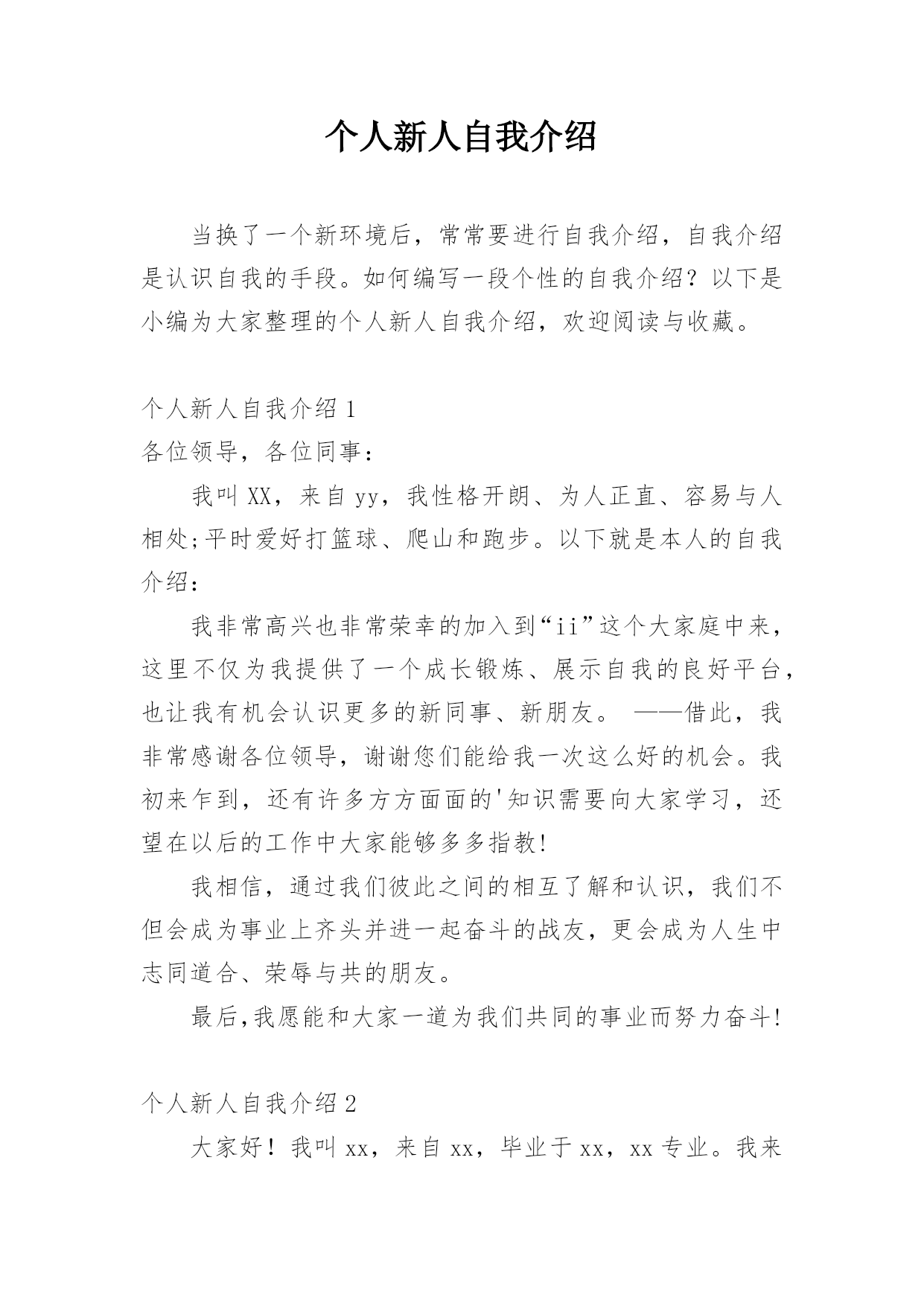 个人新人自我介绍当换了一个新环境后,常常要进行自我介绍,自我介绍是认识自我的手段。如何编写一段个性的自我介绍?以下是小编为大家整理的个人新人自我介绍,欢迎阅读与收藏。个人新人自我介绍1各位领导,各位同事:我叫XX,来自yy,我性格开朗、为人正直、容易与人相处;平时爱好打篮球、爬山和跑步。以下就是本人的自我介绍:我非常高兴也非常荣幸的加入到“ii”这个大家庭中来,这里不仅为我提供了一个成长锻炼、展示自我的良好平台,也让我有机会认识更多的新同事、新朋友。——借此,我非常感谢各位领导,谢谢您们能给我一次这么好的
