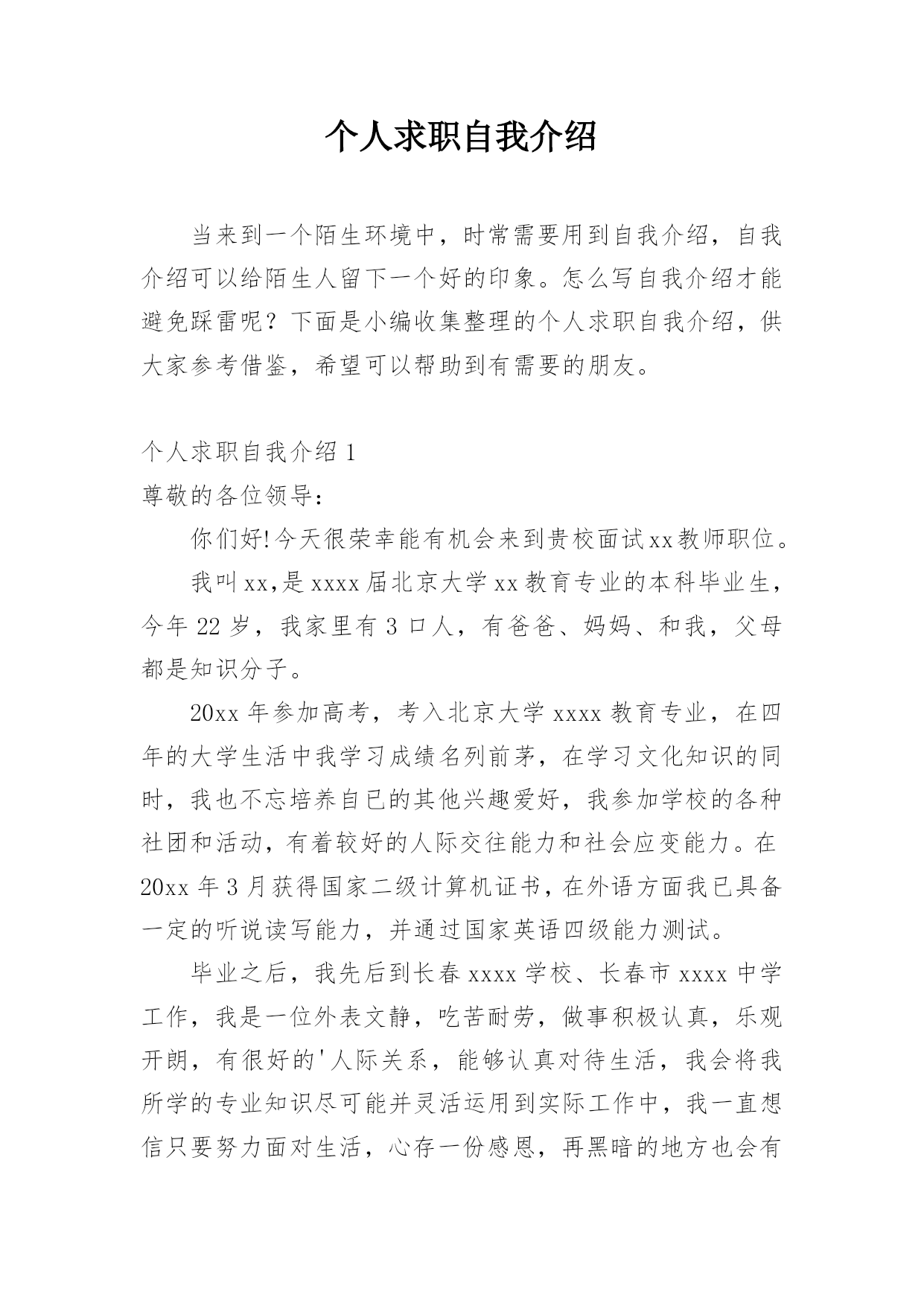 个人求职自我介绍当来到一个陌生环境中,时常需要用到自我介绍,自我介绍可以给陌生人留下一个好的印象。怎么写自我介绍才能避免踩雷呢?下面是小编收集整理的个人求职自我介绍,供大家参考借鉴,希望可以帮助到有需要的朋友。个人求职自我介绍1尊敬的各位领导:你们好!今天很荣幸能有机会来到贵校面试xx教师职位。我叫xx,是xxxx届北京大学xx教育专业的本科毕业生,今年22岁,我家里有3口人,有爸爸、妈妈、和我,父母都是知识分子。20xx年参加高考,考入北京大学xxxx教育专业,在四年的大学生活中我学习成绩名列前茅,在学