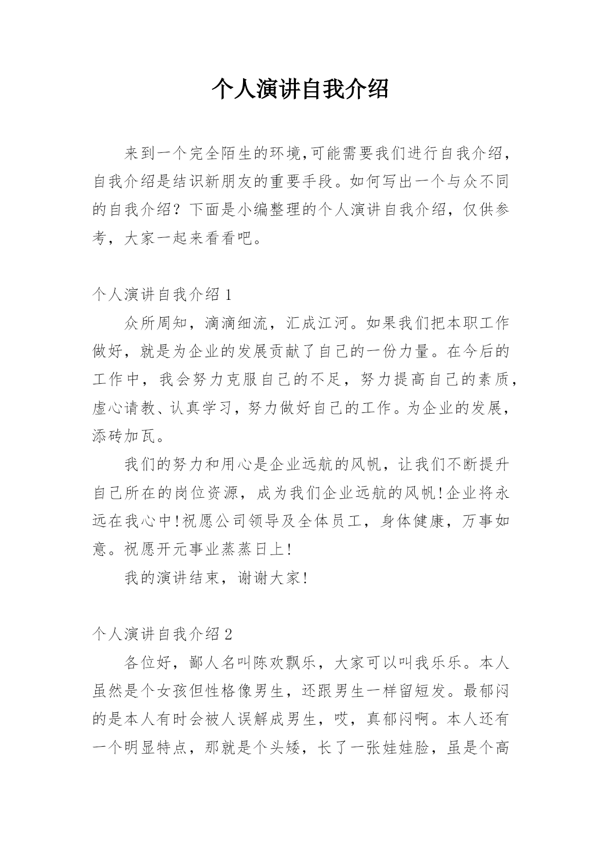 个人演讲自我介绍来到一个完全陌生的环境,可能需要我们进行自我介绍,自我介绍是结识新朋友的重要手段。如何写出一个与众不同的自我介绍?下面是小编整理的个人演讲自我介绍,仅供参考,大家一起来看看吧。个人演讲自我介绍1众所周知,滴滴细流,汇成江河。如果我们把本职工作做好,就是为企业的发展贡献了自己的一份力量。在今后的工作中,我会努力克服自己的不足,努力提高自己的素质,虚心请教、认真学习,努力做好自己的工作。为企业的发展,添砖加瓦。我们的努力和用心是企业远航的风帆,让我们不断提升自己所在的岗位资源,成为我们企业远航