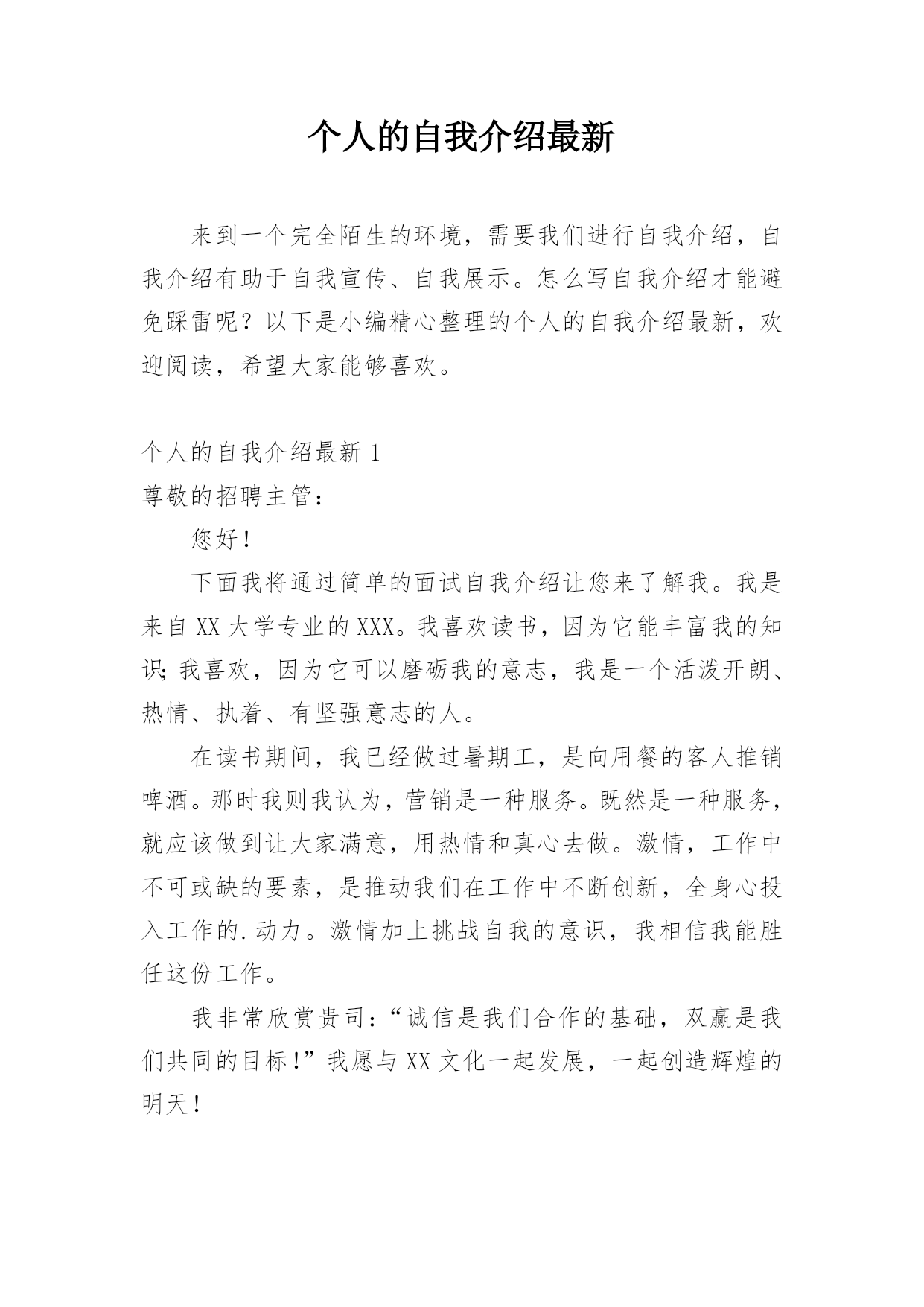 个人的自我介绍最新来到一个完全陌生的环境,需要我们进行自我介绍,自我介绍有助于自我宣传、自我展示。怎么写自我介绍才能避免踩雷呢?以下是小编精心整理的个人的自我介绍最新,欢迎阅读,希望大家能够喜欢。个人的自我介绍最新1尊敬的招聘主管:您好!下面我将通过简单的面试自我介绍让您来了解我。我是来自XX大学专业的XXX。我喜欢读书,因为它能丰富我的知识;我喜欢,因为它可以磨砺我的意志,我是一个活泼开朗、热情、执着、有坚强意志的人。在读书期间,我已经做过暑期工,是向用餐的客人推销啤酒。那时我则我认为,营销是一种服务。