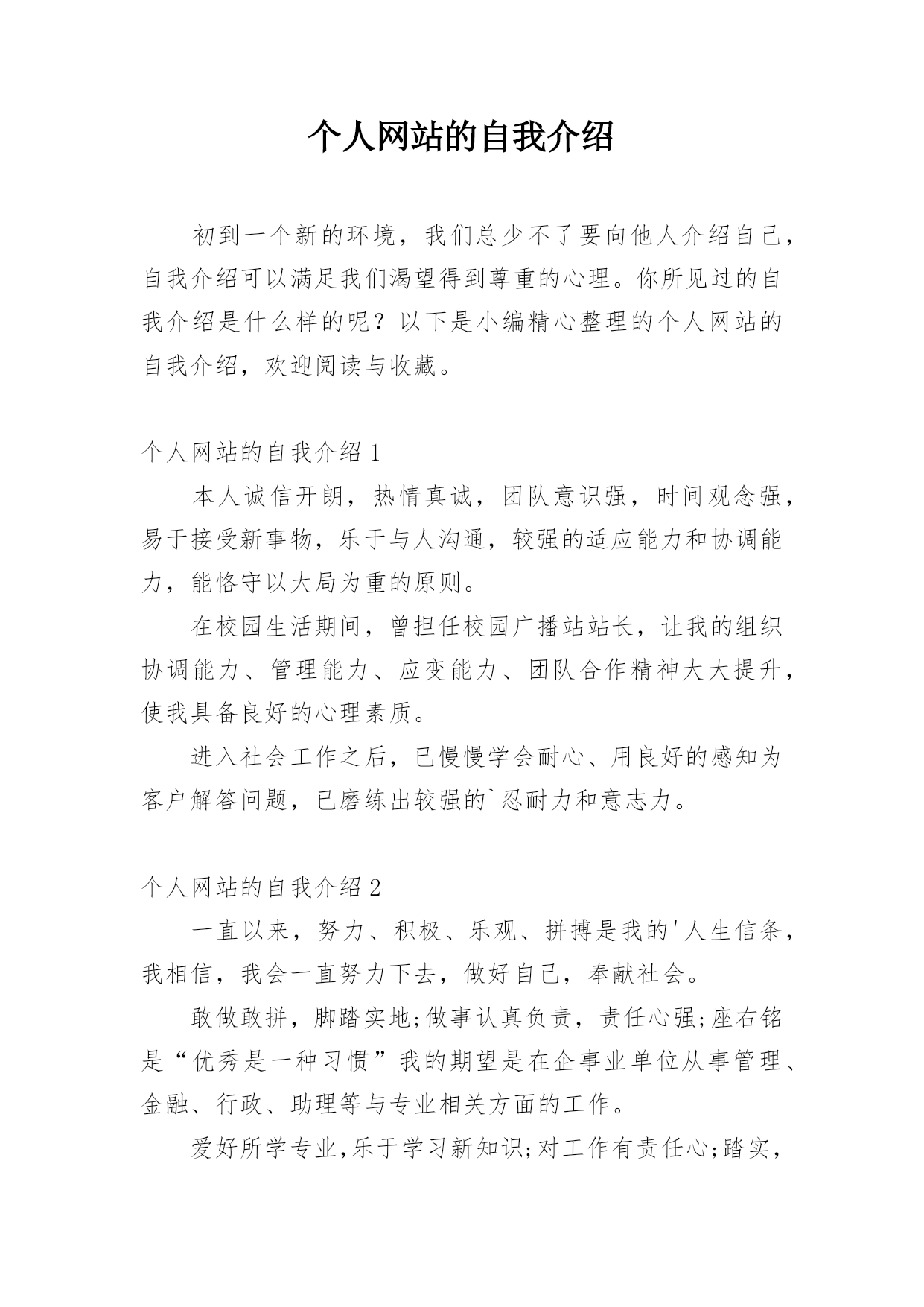 个人网站的自我介绍初到一个新的环境,我们总少不了要向他人介绍自己,自我介绍可以满足我们渴望得到尊重的心理。你所见过的自我介绍是什么样的呢?以下是小编精心整理的个人网站的自我介绍,欢迎阅读与收藏。个人网站的自我介绍1本人诚信开朗,热情真诚,团队意识强,时间观念强,易于接受新事物,乐于与人沟通,较强的适应能力和协调能力,能恪守以大局为重的原则。在校园生活期间,曾担任校园广播站站长,让我的组织协调能力、管理能力、应变能力、团队合作精神大大提升,使我具备良好的心理素质。进入社会工作之后,已慢慢学会耐心、用良好的感
