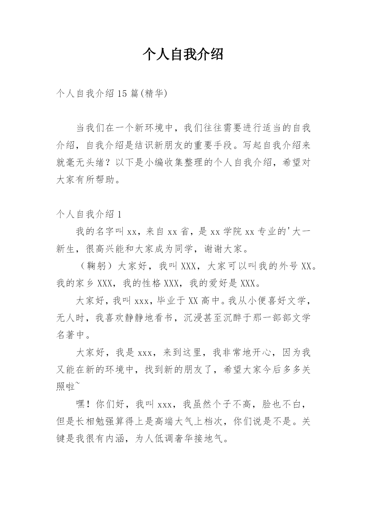 个人自我介绍个人自我介绍15篇(精华)当我们在一个新环境中,我们往往需要进行适当的自我介绍,自我介绍是结识新朋友的重要手段。写起自我介绍来就毫无头绪?以下是小编收集整理的个人自我介绍,希望对大家有所帮助。个人自我介绍1我的名字叫xx,来自xx省,是xx学院xx专业的'大一新生,很高兴能和大家成为同学,谢谢大家。(鞠躬)大家好,我叫XXX,大家可以叫我的外号XX。我的家乡XXX,我的性格XXX,我的爱好是XXX。大家好,我叫xxx,毕业于XX高中。我从小便喜好文学,无人时,我喜欢静静地看书,沉浸甚至沉醉于那