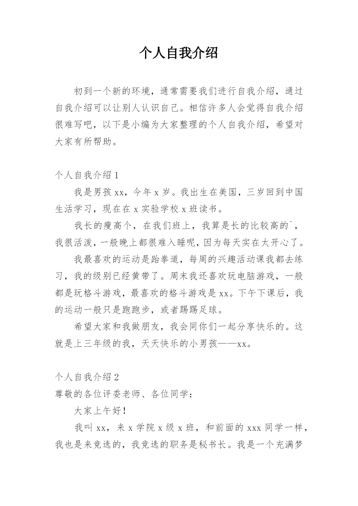 个人自我介绍初到一个新的环境,通常需要我们进行自我介绍,通过自我介绍可以让别人认识自己。相信许多人会觉得自我介绍很难写吧,以下是小编为大家整理的个人自我介绍,希望对大家有所帮助。个人自我介绍1我是男孩xx,今年x岁。我出生在美国,三岁回到中国生活学习,现在在x实验学校x班读书。我长的瘦高个,在我们班上,我算是长的比较高的`,我很活泼,一般晚上都很难入睡呢,因为每天实在太开心了。我最喜欢的运动是跆拳道,每周的兴趣活动课我都去练习,我的级别已经黄带了。周末我还喜欢玩电脑游戏,一般都是玩格斗游戏,最喜欢的格斗游
