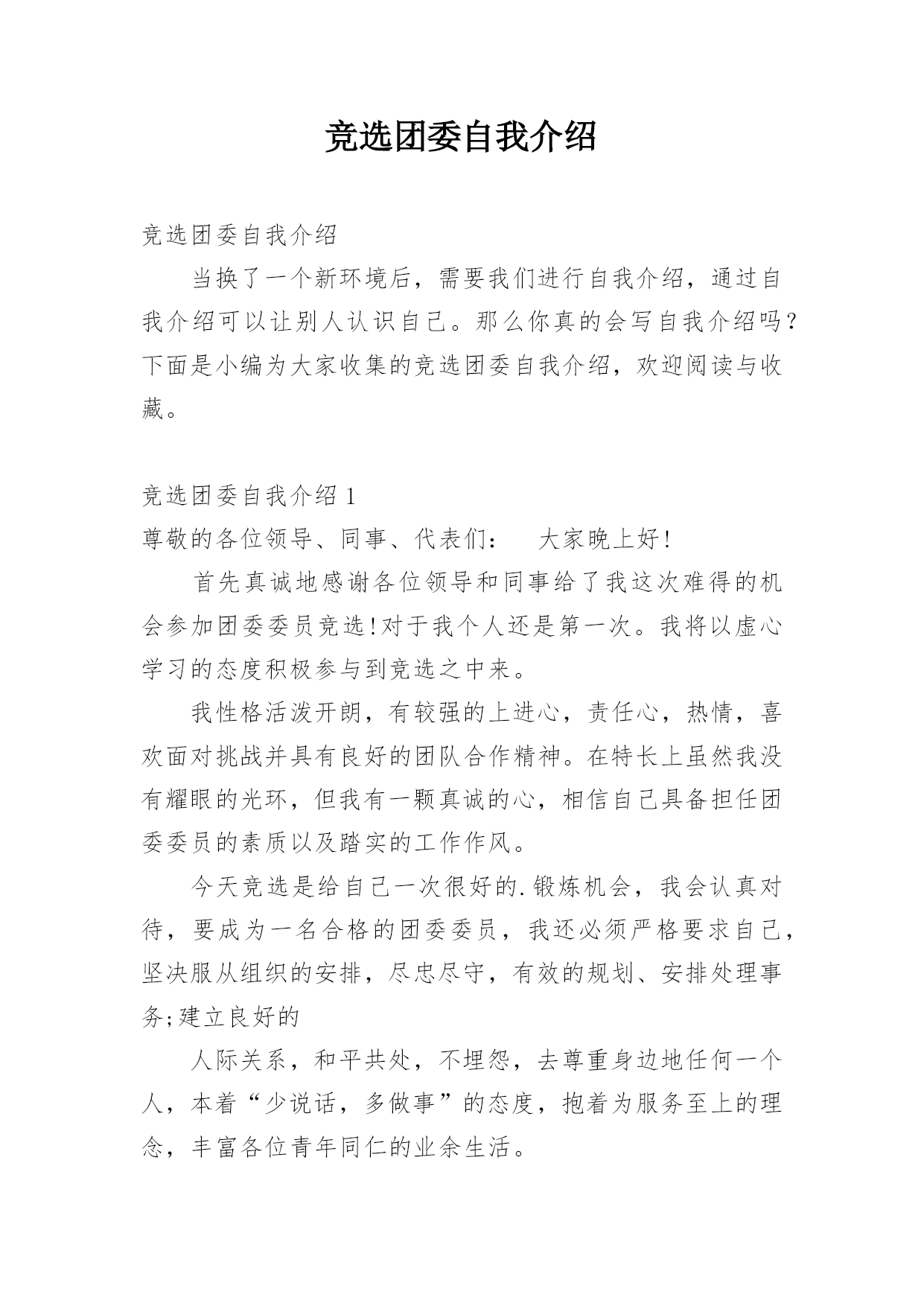 竞选团委自我介绍竞选团委自我介绍当换了一个新环境后,需要我们进行自我介绍,通过自我介绍可以让别人认识自己。那么你真的会写自我介绍吗?下面是小编为大家收集的竞选团委自我介绍,欢迎阅读与收藏。竞选团委自我介绍1尊敬的各位领导、同事、代表们:大家晚上好!首先真诚地感谢各位领导和同事给了我这次难得的机会参加团委委员竞选!对于我个人还是第一次。我将以虚心学习的态度积极参与到竞选之中来。我性格活泼开朗,有较强的上进心,责任心,热情,喜欢面对挑战并具有良好的团队合作精神。在特长上虽然我没有耀眼的光环,但我有一颗真诚的心
