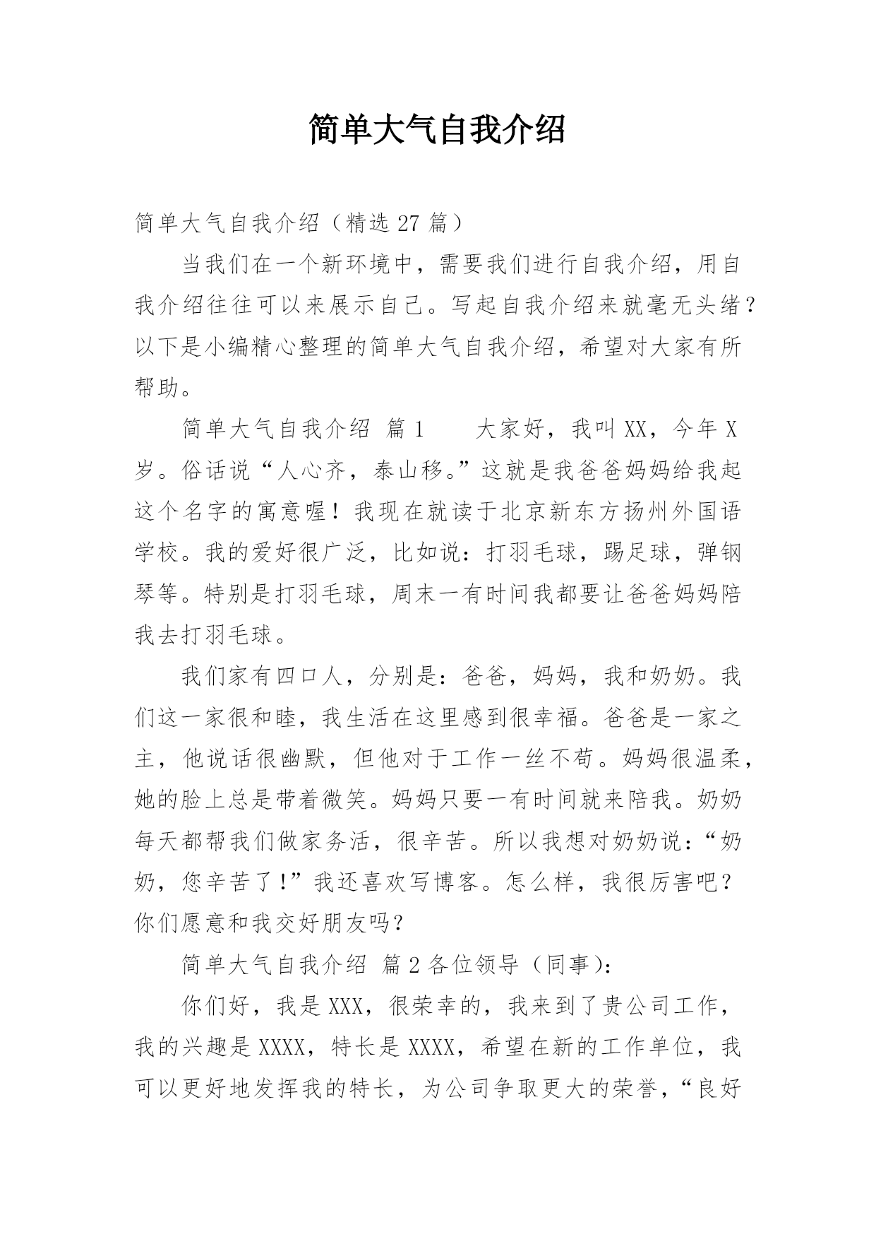 简单大气自我介绍简单大气自我介绍(精选27篇)当我们在一个新环境中,需要我们进行自我介绍,用自我介绍往往可以来展示自己。写起自我介绍来就毫无头绪?以下是小编精心整理的简单大气自我介绍,希望对大家有所帮助。简单大气自我介绍篇1大家好,我叫XX,今年X岁。俗话说“人心齐,泰山移。”这就是我爸爸妈妈给我起这个名字的寓意喔!我现在就读于北京新东方扬州外国语学校。我的爱好很广泛,比如说:打羽毛球,踢足球,弹钢琴等。特别是打羽毛球,周末一有时间我都要让爸爸妈妈陪我去打羽毛球。我们家有四口人,分别是:爸爸,妈妈,我和奶