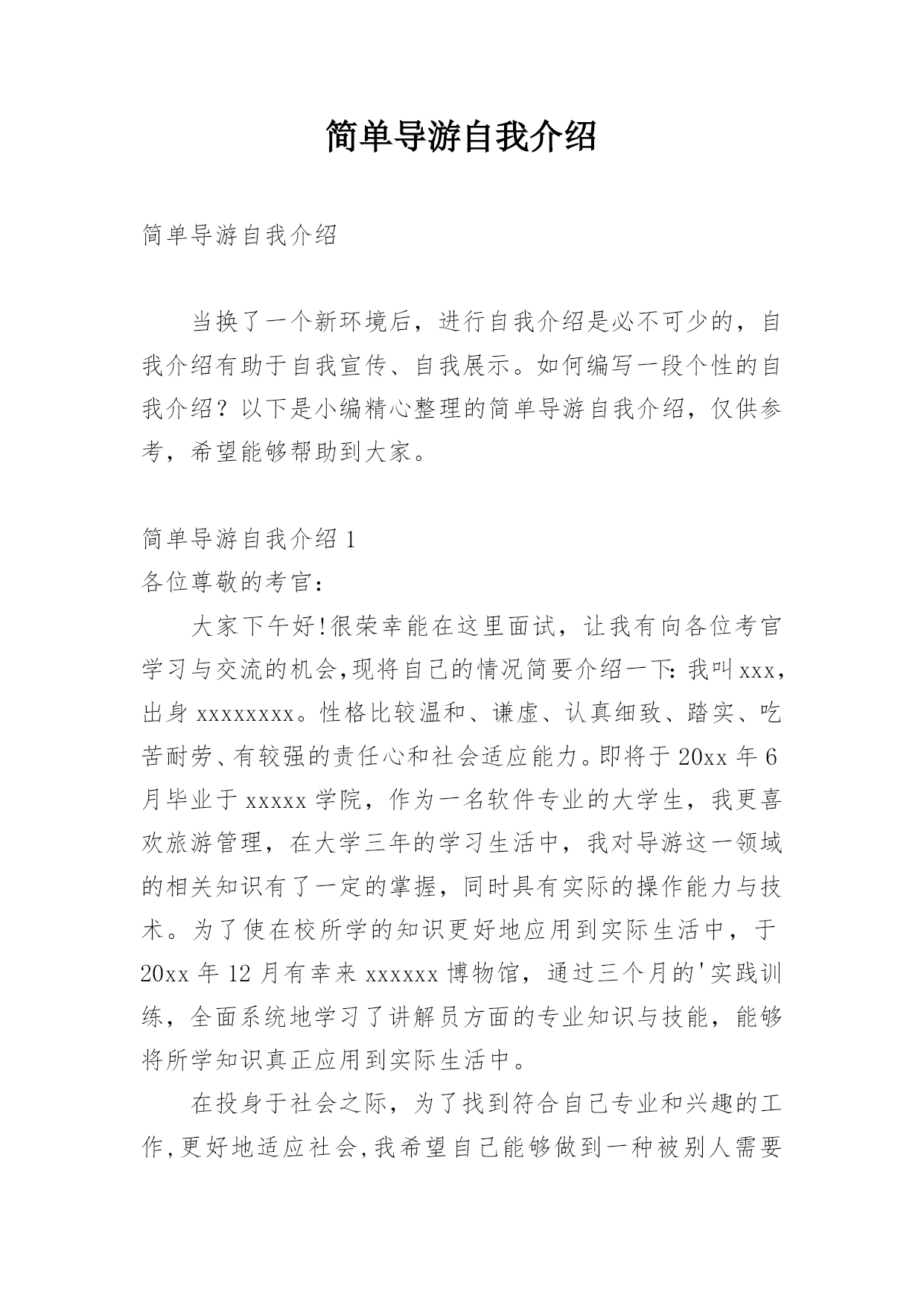 简单导游自我介绍简单导游自我介绍当换了一个新环境后,进行自我介绍是必不可少的,自我介绍有助于自我宣传、自我展示。如何编写一段个性的自我介绍?以下是小编精心整理的简单导游自我介绍,仅供参考,希望能够帮助到大家。简单导游自我介绍1各位尊敬的考官:大家下午好!很荣幸能在这里面试,让我有向各位考官学习与交流的机会,现将自己的情况简要介绍一下:我叫xxx,出身xxxxxxxx。性格比较温和、谦虚、认真细致、踏实、吃苦耐劳、有较强的责任心和社会适应能力。即将于20xx年6月毕业于xxxxx学院,作为一名软件专业的大学