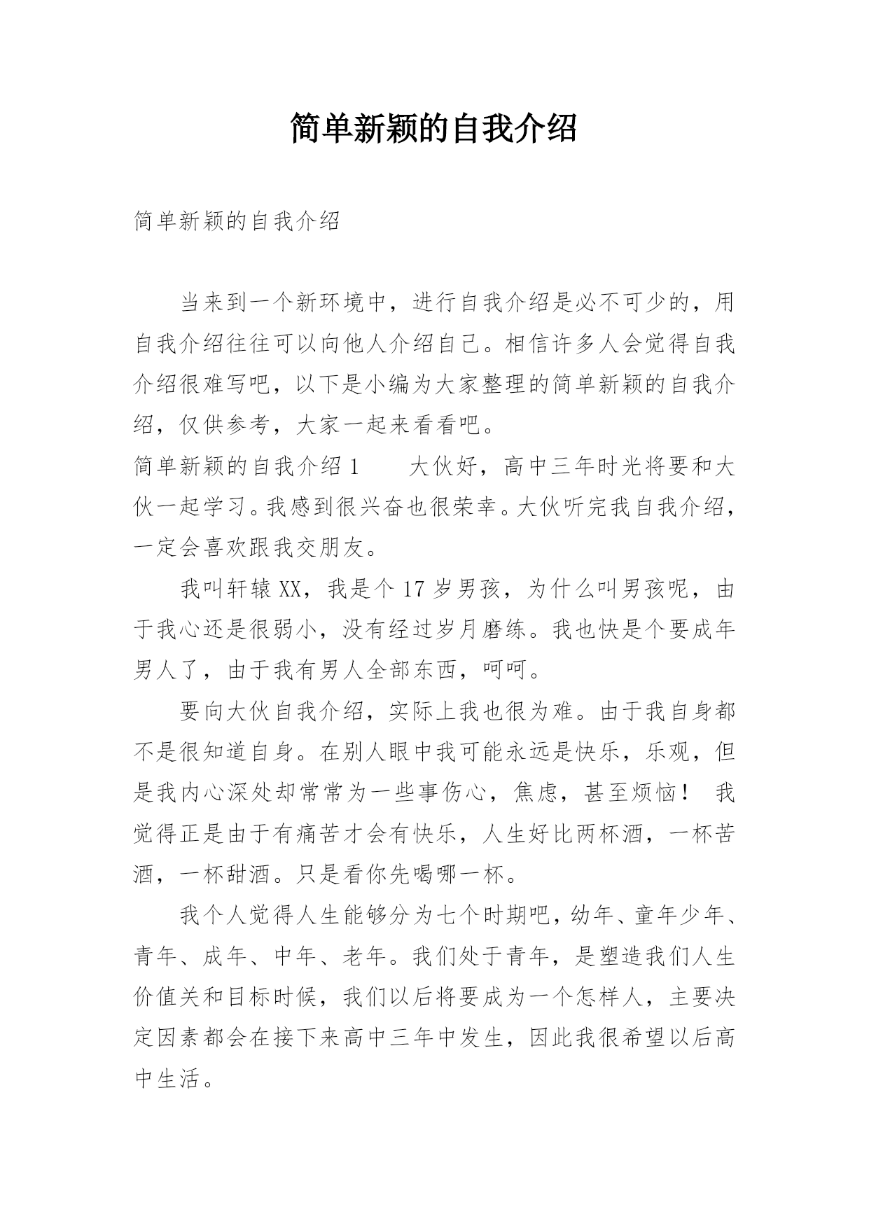 简单新颖的自我介绍简单新颖的自我介绍当来到一个新环境中,进行自我介绍是必不可少的,用自我介绍往往可以向他人介绍自己。相信许多人会觉得自我介绍很难写吧,以下是小编为大家整理的简单新颖的自我介绍,仅供参考,大家一起来看看吧。简单新颖的自我介绍1大伙好,高中三年时光将要和大伙一起学习。我感到很兴奋也很荣幸。大伙听完我自我介绍,一定会喜欢跟我交朋友。我叫轩辕XX,我是个17岁男孩,为什么叫男孩呢,由于我心还是很弱小,没有经过岁月磨练。我也快是个要成年男人了,由于我有男人全部东西,呵呵。要向大伙自我介绍,实际上我也