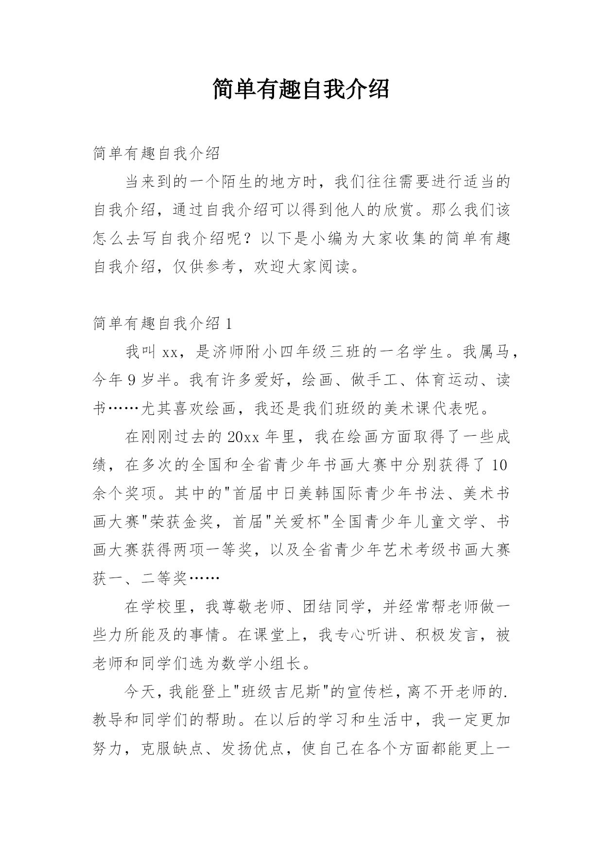 简单有趣自我介绍简单有趣自我介绍当来到的一个陌生的地方时,我们往往需要进行适当的自我介绍,通过自我介绍可以得到他人的欣赏。那么我们该怎么去写自我介绍呢?以下是小编为大家收集的简单有趣自我介绍,仅供参考,欢迎大家阅读。简单有趣自我介绍1我叫xx,是济师附小四年级三班的一名学生。我属马,今年9岁半。我有许多爱好,绘画、做手工、体育运动、读书……尤其喜欢绘画,我还是我们班级的美术课代表呢。在刚刚过去的20xx年里,我在绘画方面取得了一些成绩,在多次的全国和全省青少年书画大赛中分别获得了10余个奖项。其中的"首届