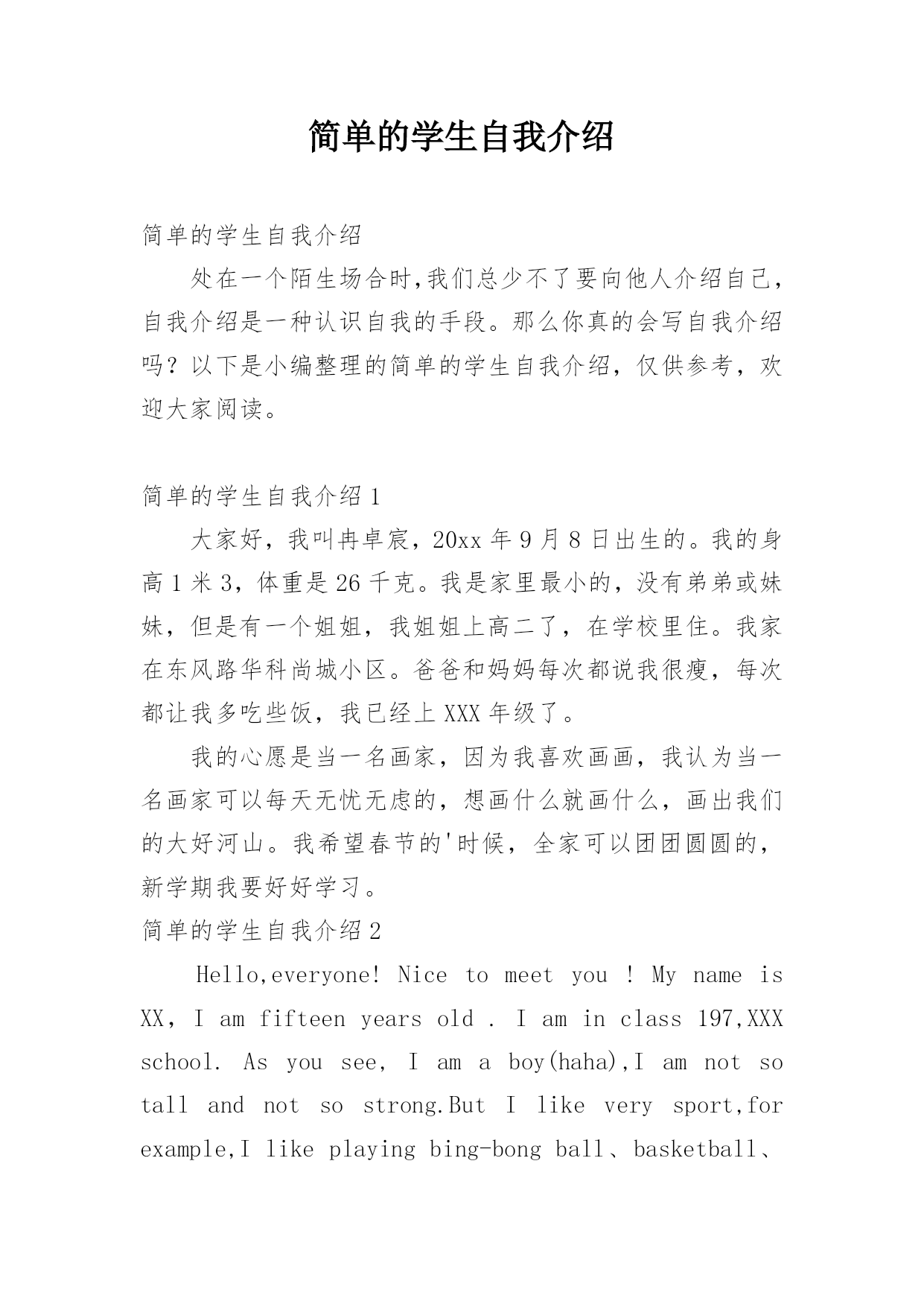 简单的学生自我介绍简单的学生自我介绍处在一个陌生场合时,我们总少不了要向他人介绍自己,自我介绍是一种认识自我的手段。那么你真的会写自我介绍吗?以下是小编整理的简单的学生自我介绍,仅供参考,欢迎大家阅读。简单的学生自我介绍1大家好,我叫冉卓宸,20xx年9月8日出生的。我的身高1米3,体重是26千克。我是家里最小的,没有弟弟或妹妹,但是有一个姐姐,我姐姐上高二了,在学校里住。我家在东风路华科尚城小区。爸爸和妈妈每次都说我很瘦,每次都让我多吃些饭,我已经上XXX年级了。我的心愿是当一名画家,因为我喜欢画画,我
