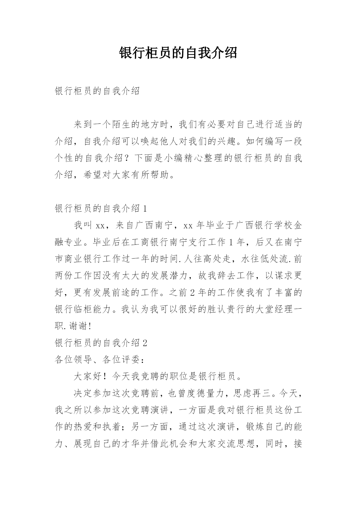 银行柜员的自我介绍银行柜员的自我介绍来到一个陌生的地方时,我们有必要对自己进行适当的介绍,自我介绍可以唤起他人对我们的兴趣。如何编写一段个性的自我介绍?下面是小编精心整理的银行柜员的自我介绍,希望对大家有所帮助。银行柜员的自我介绍1我叫xx,来自广西南宁,xx年毕业于广西银行学校金融专业。毕业后在工商银行南宁支行工作1年,后又在南宁市商业银行工作过一年的时间.人往高处走,水往低处流.前两份工作因没有太大的发展潜力,故我辞去工作,以谋求更好,更有发展前途的工作。之前2年的工作使我有了丰富的银行临柜能力。我认