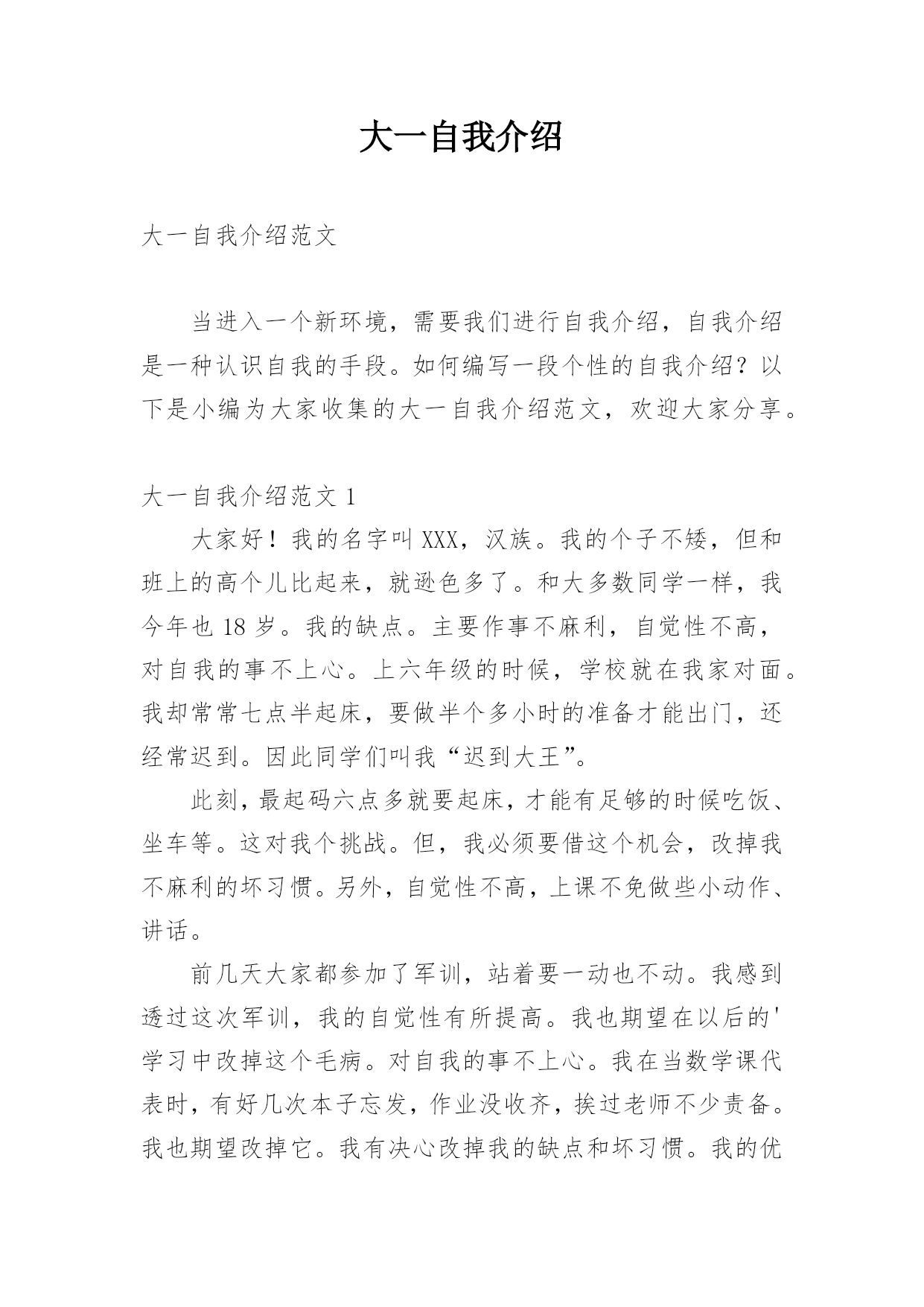 大一自我介绍大一自我介绍范文当进入一个新环境,需要我们进行自我介绍,自我介绍是一种认识自我的手段。如何编写一段个性的自我介绍?以下是小编为大家收集的大一自我介绍范文,欢迎大家分享。大一自我介绍范文1大家好!我的名字叫XXX,汉族。我的个子不矮,但和班上的高个儿比起来,就逊色多了。和大多数同学一样,我今年也18岁。我的缺点。主要作事不麻利,自觉性不高,对自我的事不上心。上六年级的时候,学校就在我家对面。我却常常七点半起床,要做半个多小时的准备才能出门,还经常迟到。因此同学们叫我“迟到大王”。此刻,最起码六点