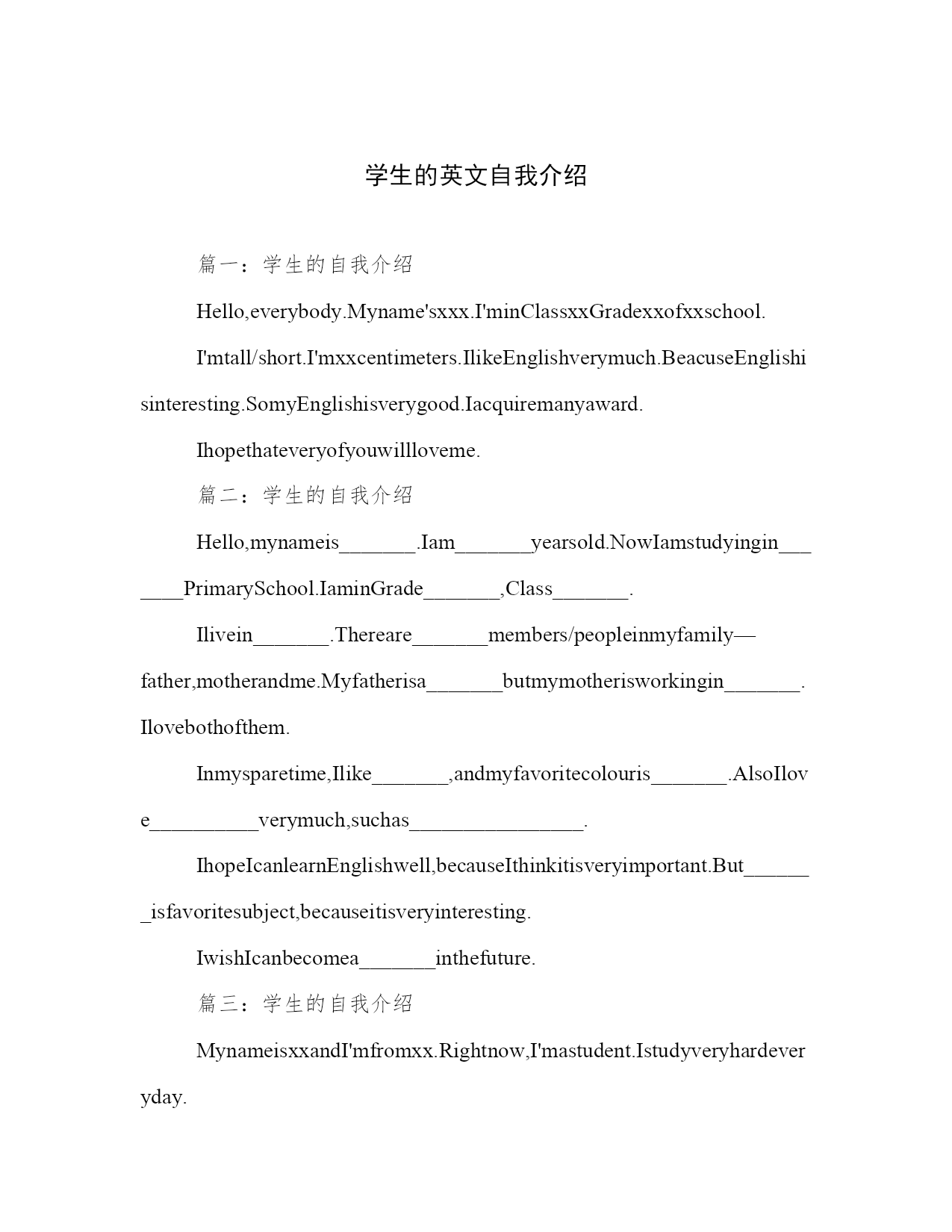 学生的英文自我介绍篇一:学生的自我介绍Hello,everybody.Myname'sxxx.I'minClassxxGradexxofxxschool.I'mtall/short.I'mxxcentimeters.IlikeEnglishverymuch.BeacuseEnglishisinteresting.SomyEnglishisverygood.Iacquiremanyaward.Ihopethateveryofyouwillloveme.篇二:学生的自我介绍Hello,mynameis____