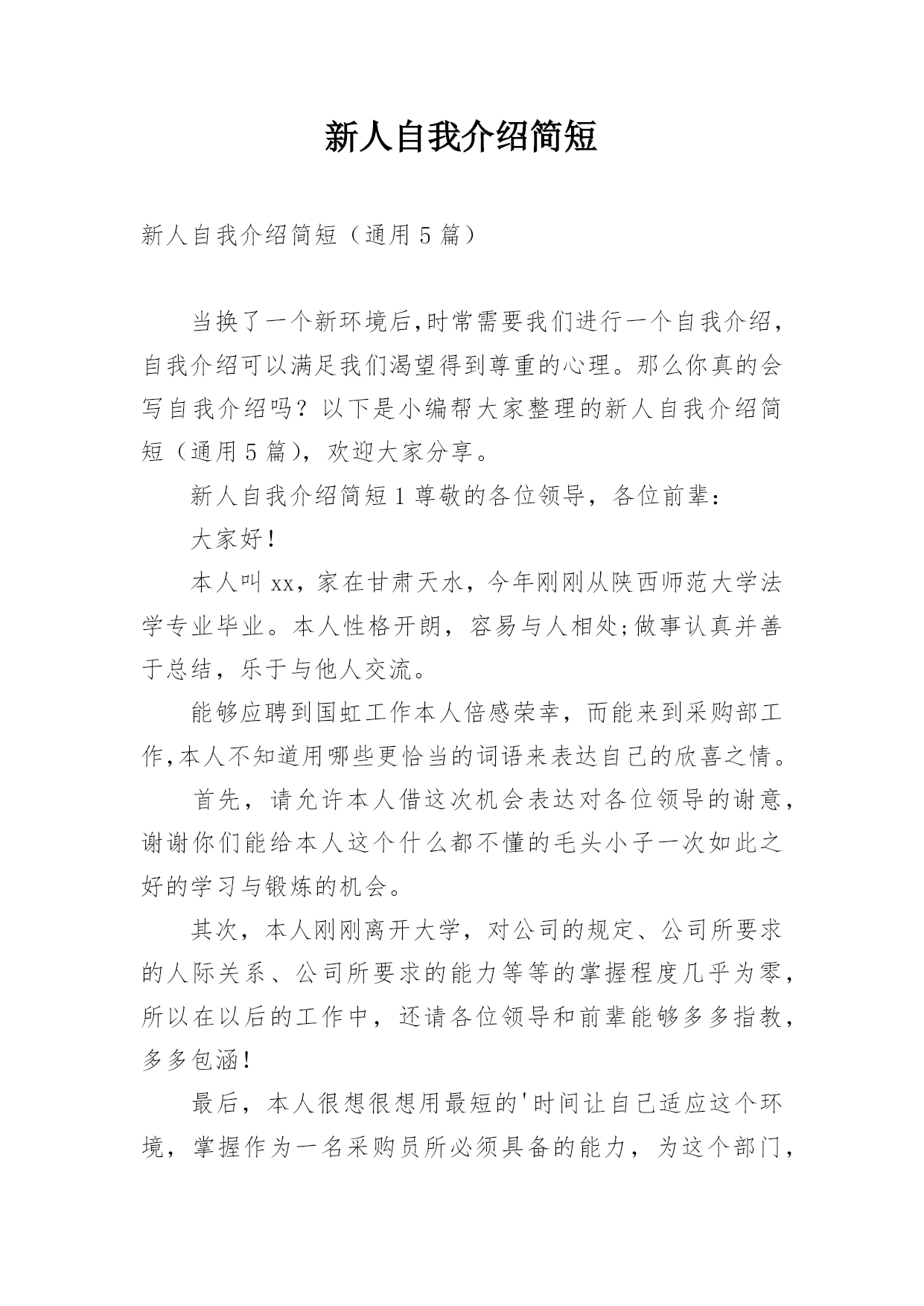 新人自我介绍简短新人自我介绍简短(通用5篇)当换了一个新环境后,时常需要我们进行一个自我介绍,自我介绍可以满足我们渴望得到尊重的心理。那么你真的会写自我介绍吗?以下是小编帮大家整理的新人自我介绍简短(通用5篇),欢迎大家分享。新人自我介绍简短1尊敬的各位领导,各位前辈:大家好!本人叫xx,家在甘肃天水,今年刚刚从陕西师范大学法学专业毕业。本人性格开朗,容易与人相处;做事认真并善于总结,乐于与他人交流。能够应聘到国虹工作本人倍感荣幸,而能来到采购部工作,本人不知道用哪些更恰当的词语来表达自己的欣喜之情。首先