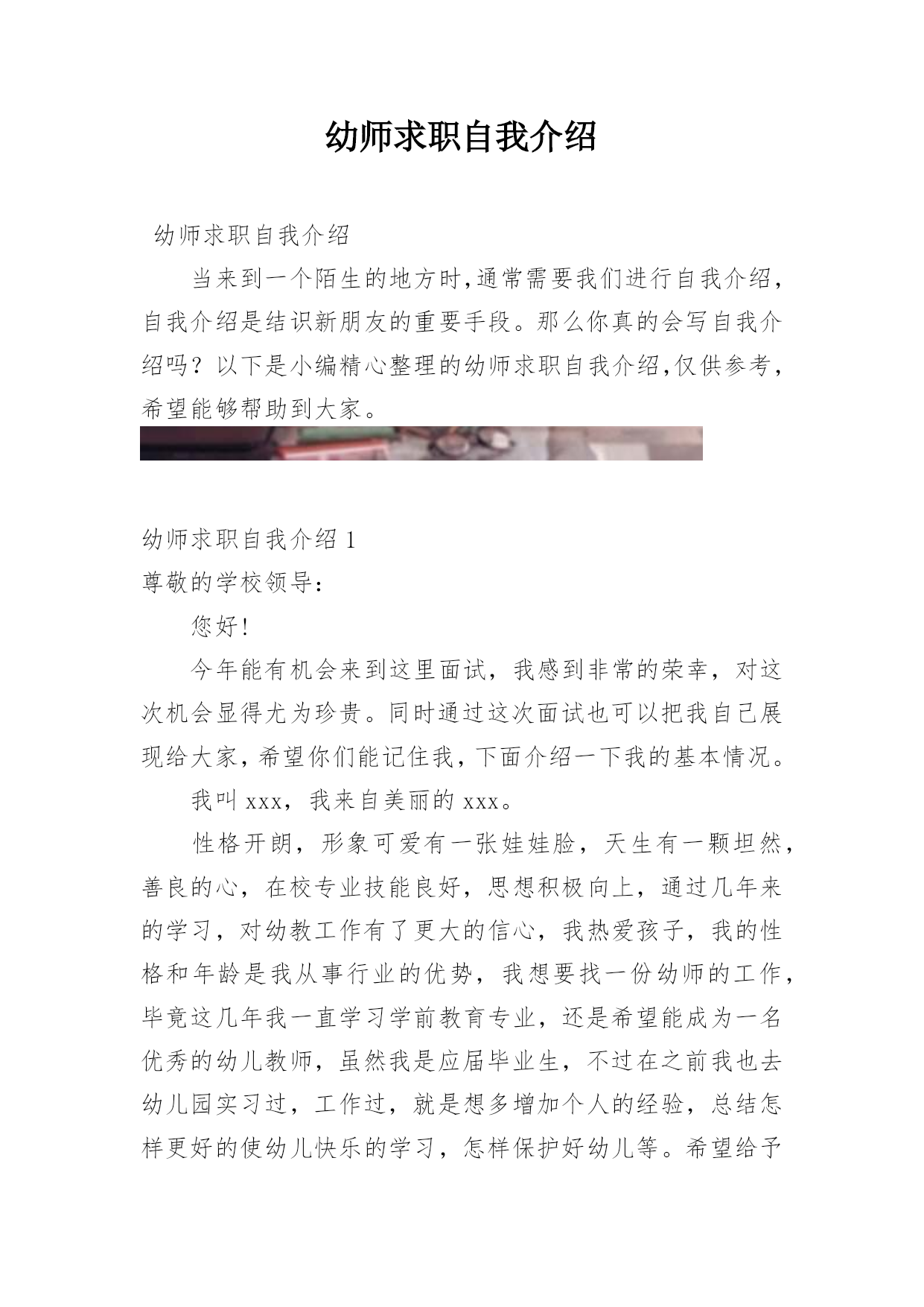 幼师求职自我介绍幼师求职自我介绍当来到一个陌生的地方时,通常需要我们进行自我介绍,自我介绍是结识新朋友的重要手段。那么你真的会写自我介绍吗?以下是小编精心整理的幼师求职自我介绍,仅供参考,希望能够帮助到大家。幼师求职自我介绍1尊敬的学校领导:您好!今年能有机会来到这里面试,我感到非常的荣幸,对这次机会显得尤为珍贵。同时通过这次面试也可以把我自己展现给大家,希望你们能记住我,下面介绍一下我的基本情况。我叫xxx,我来自美丽的xxx。性格开朗,形象可爱有一张娃娃脸,天生有一颗坦然,善良的心,在校专业技能良好,