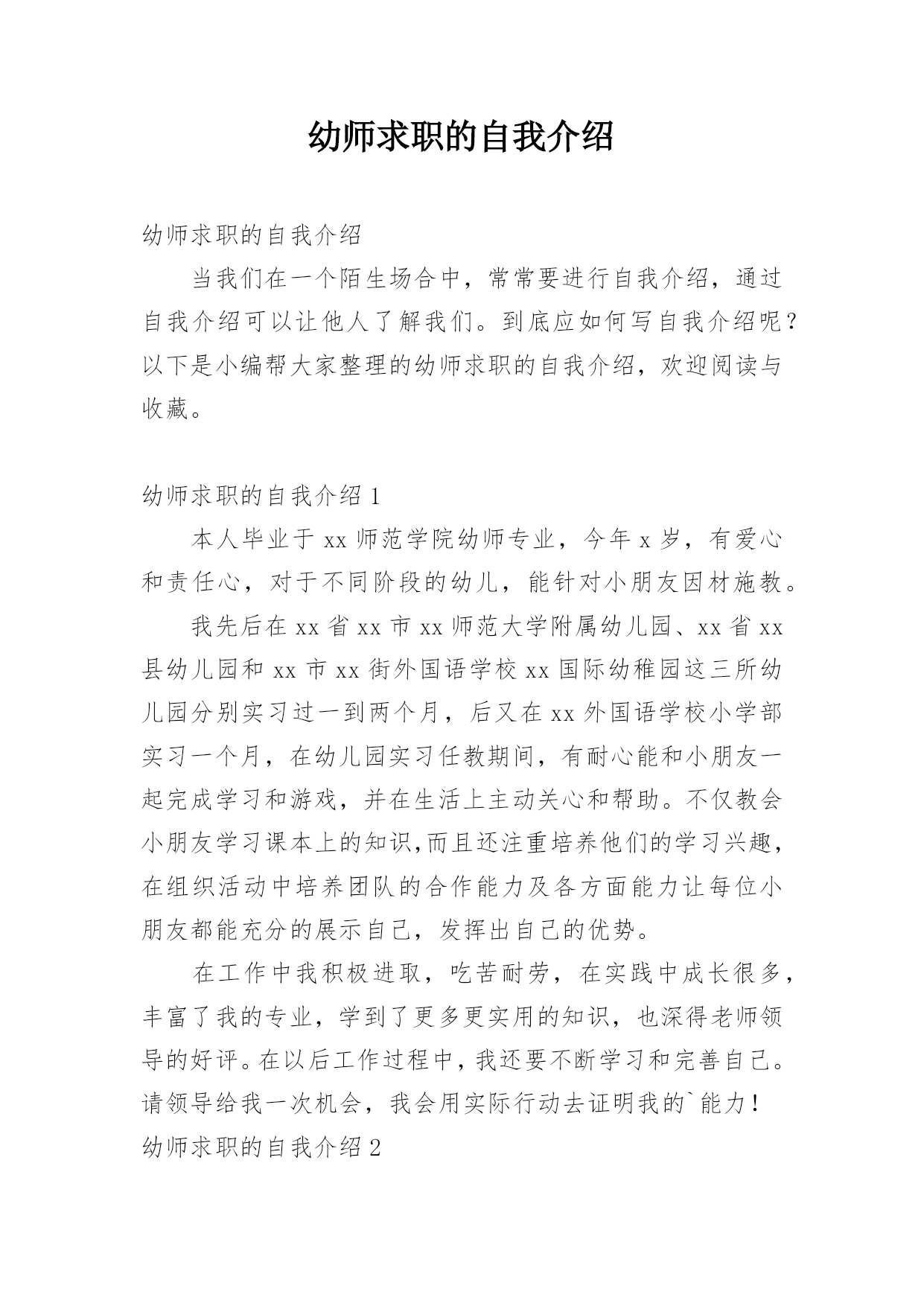 幼师求职的自我介绍幼师求职的自我介绍当我们在一个陌生场合中,常常要进行自我介绍,通过自我介绍可以让他人了解我们。到底应如何写自我介绍呢?以下是小编帮大家整理的幼师求职的自我介绍,欢迎阅读与收藏。幼师求职的自我介绍1本人毕业于xx师范学院幼师专业,今年x岁,有爱心和责任心,对于不同阶段的幼儿,能针对小朋友因材施教。我先后在xx省xx市xx师范大学附属幼儿园、xx省xx县幼儿园和xx市xx街外国语学校xx国际幼稚园这三所幼儿园分别实习过一到两个月,后又在xx外国语学校小学部实习一个月,在幼儿园实习任教期间,有