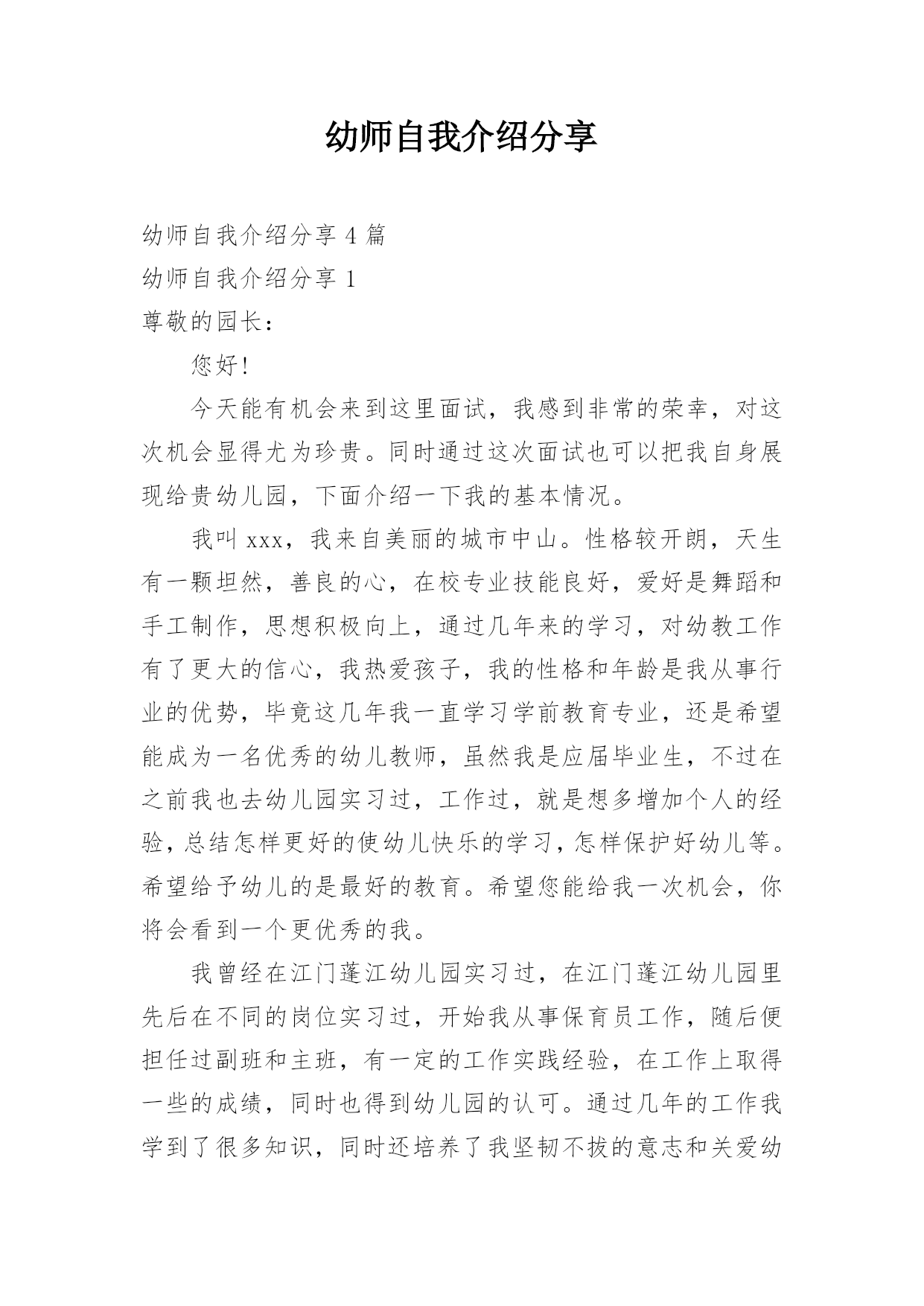幼师自我介绍分享幼师自我介绍分享4篇幼师自我介绍分享1尊敬的园长:您好!今天能有机会来到这里面试,我感到非常的荣幸,对这次机会显得尤为珍贵。同时通过这次面试也可以把我自身展现给贵幼儿园,下面介绍一下我的基本情况。我叫xxx,我来自美丽的城市中山。性格较开朗,天生有一颗坦然,善良的心,在校专业技能良好,爱好是舞蹈和手工制作,思想积极向上,通过几年来的学习,对幼教工作有了更大的信心,我热爱孩子,我的性格和年龄是我从事行业的优势,毕竟这几年我一直学习学前教育专业,还是希望能成为一名优秀的幼儿教师,虽然我是应届毕