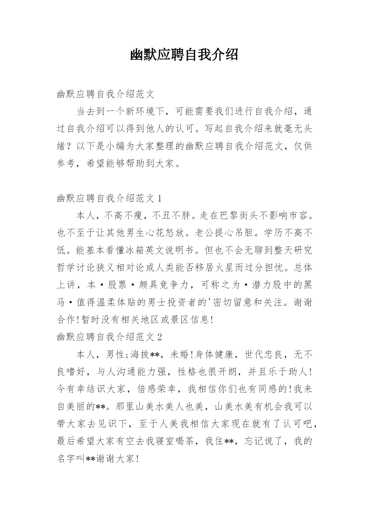 幽默应聘自我介绍幽默应聘自我介绍范文当去到一个新环境下,可能需要我们进行自我介绍,通过自我介绍可以得到他人的认可。写起自我介绍来就毫无头绪?以下是小编为大家整理的幽默应聘自我介绍范文,仅供参考,希望能够帮助到大家。幽默应聘自我介绍范文1本人,不高不瘦,不丑不胖。走在巴黎街头不影响市容。也不至于让其他男生心花怒放。老公提心吊胆。学历不高不低。能基本看懂冰箱英文说明书。但也不会无聊到整天研究哲学讨论狭义相对论或人类能否移居火星而过分担忧。总体上讲,本·股票·颇具竞争力,可称之为·潜力股中的黑马·值得温柔体贴的