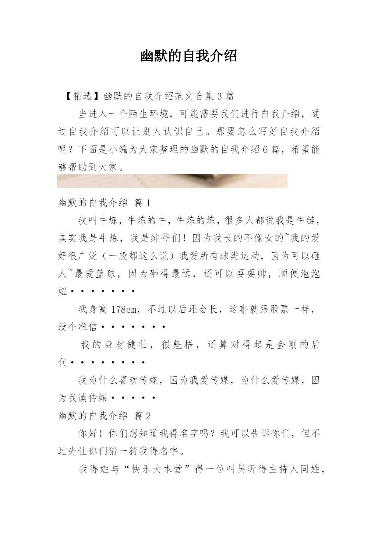 幽默的自我介绍【精选】幽默的自我介绍范文合集3篇当进入一个陌生环境,可能需要我们进行自我介绍,通过自我介绍可以让别人认识自己。那要怎么写好自我介绍呢?下面是小编为大家整理的幽默的自我介绍6篇,希望能够帮助到大家。幽默的自我介绍篇1我叫牛炼,牛炼的牛,牛炼的炼,很多人都说我是牛链,其实我是牛炼,我是纯爷们!因为我长的不像女的~我的爱好很广泛(一般都这么说)我爱所有球类运动,因为可以砸人~最爱篮球,因为砸得最远,还可以耍耍帅,顺便泡泡妞·······我身高178cm,不过以后还会长,这事就跟股票一样,没个准信