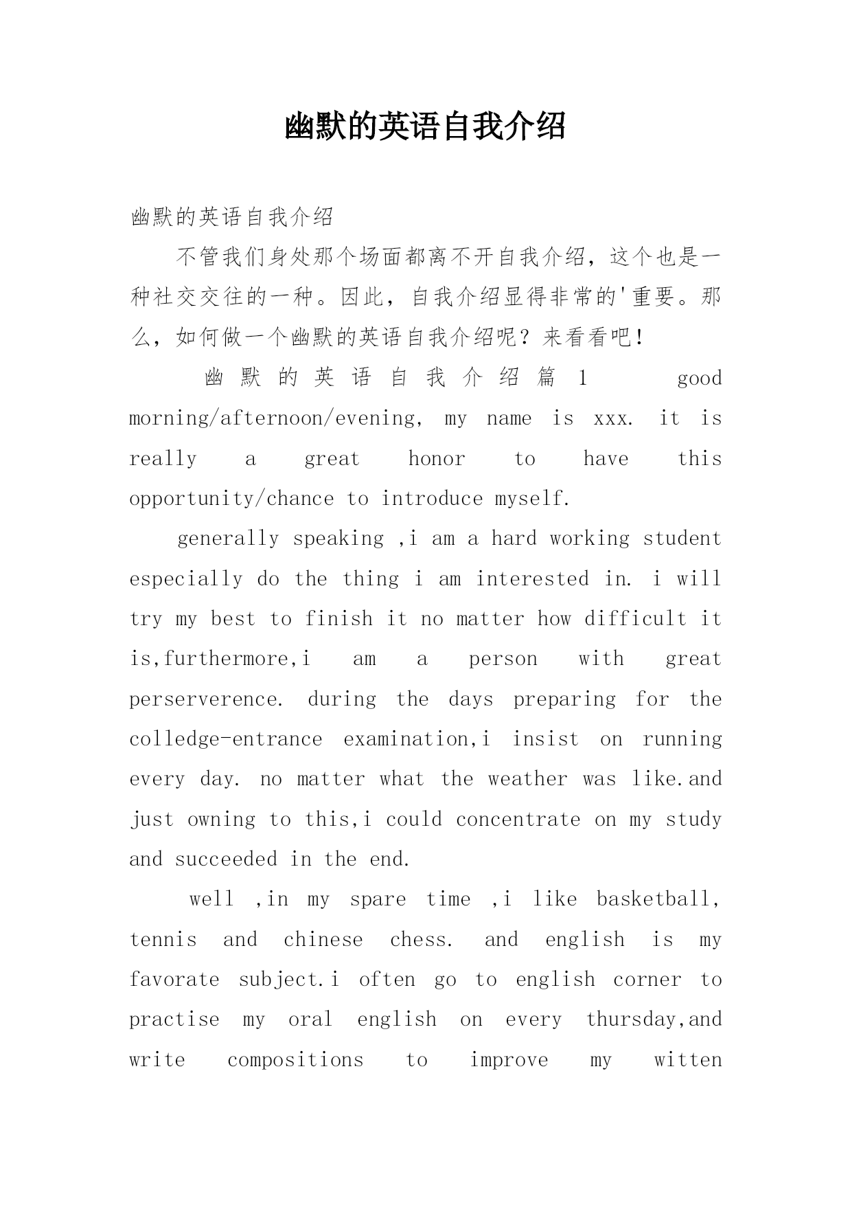 幽默的英语自我介绍幽默的英语自我介绍不管我们身处那个场面都离不开自我介绍,这个也是一种社交交往的一种。因此,自我介绍显得非常的'重要。那么,如何做一个幽默的英语自我介绍呢?来看看吧!幽默的英语自我介绍篇1goodmorning/afternoon/evening,mynameisxxx.itisreallyagreathonortohavethisopportunity/chancetointroducemyself.generallyspeaking,iamahardworkingstudentespe